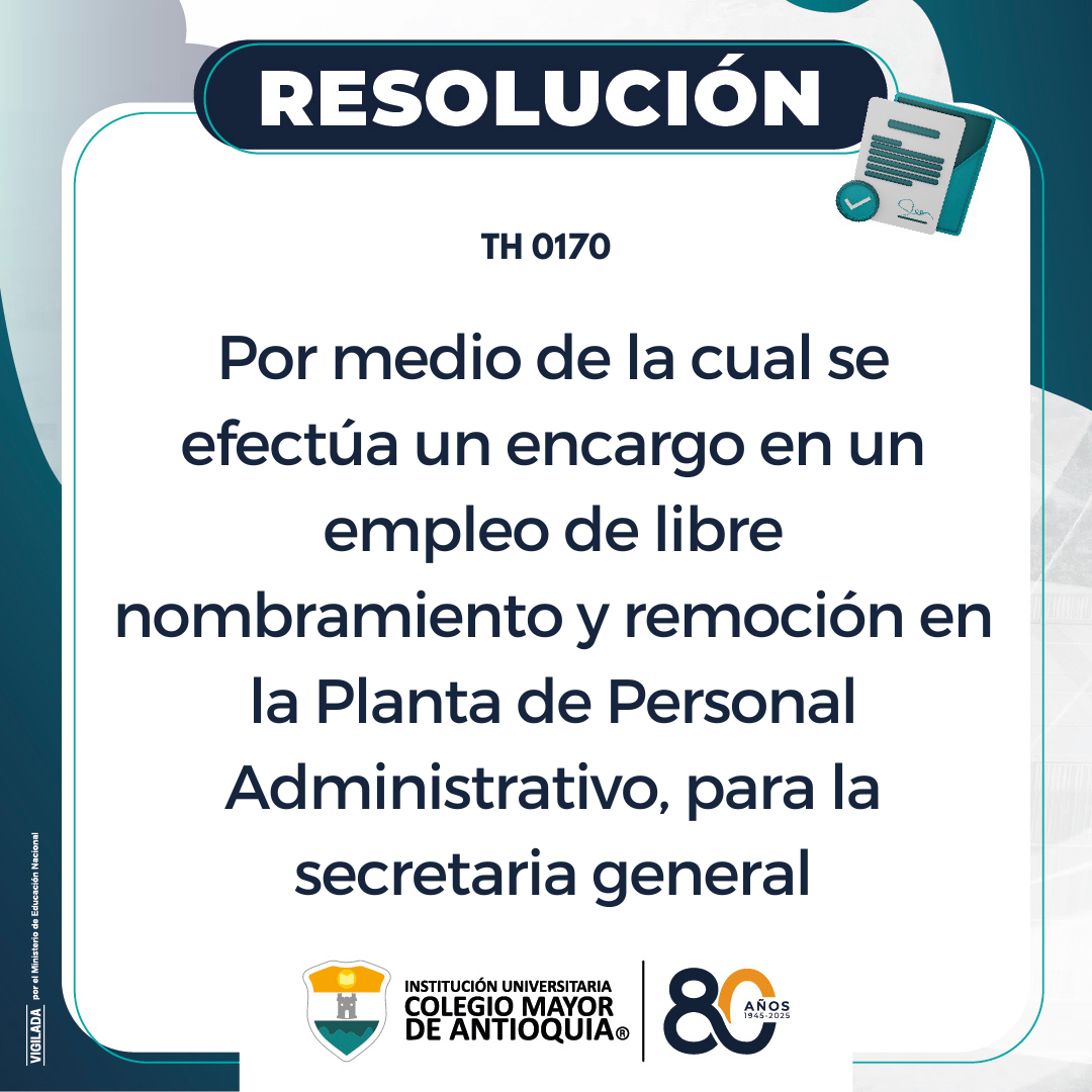 Comunicados General Noticias Resolución TH 0170: Por medio de la cual se efectúa un encargo en un empleo de libre nombramiento y remoción en la Planta de Personal Administrativo, para la secretaria general julio 21, 2025. Conoce la resolución.