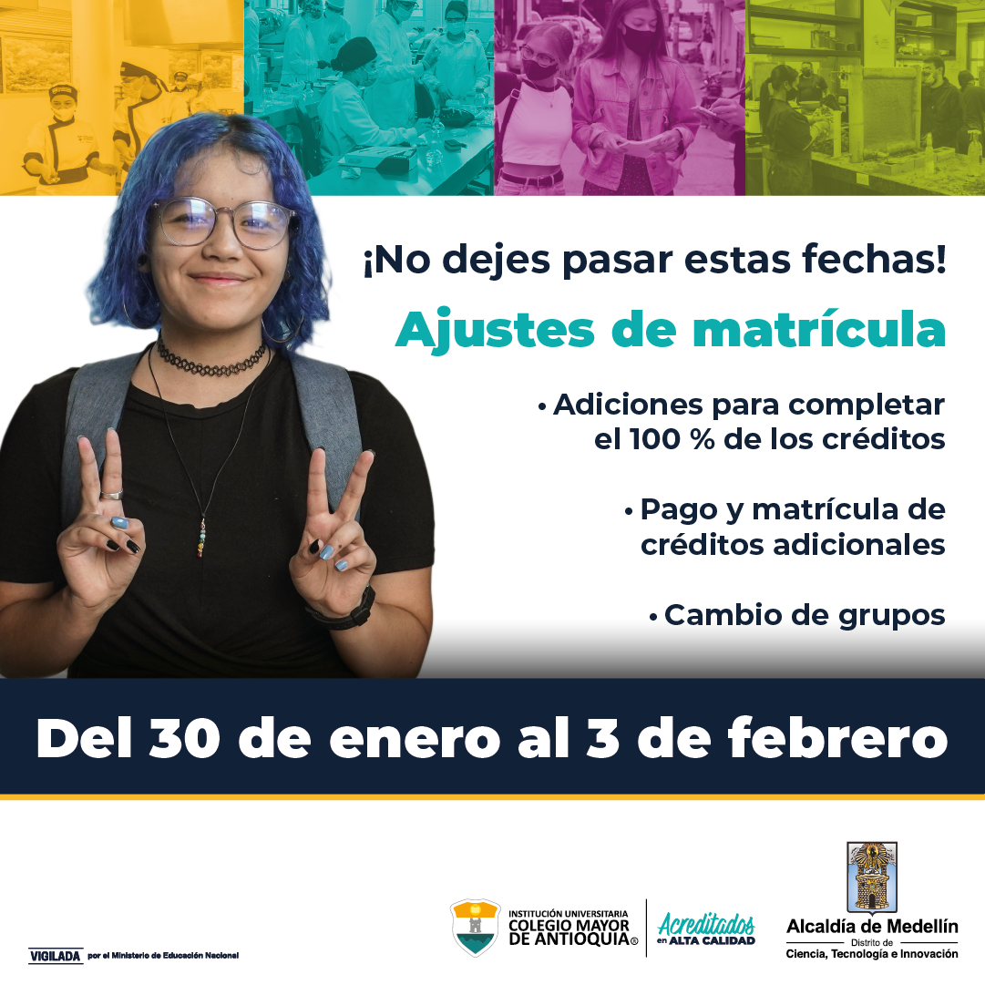 General Noticias Noticias admisiones Ajustes de matrícula, cambio de grupo y créditos adicionales 2023-1 enero 26, 2023. Conoce las guías.