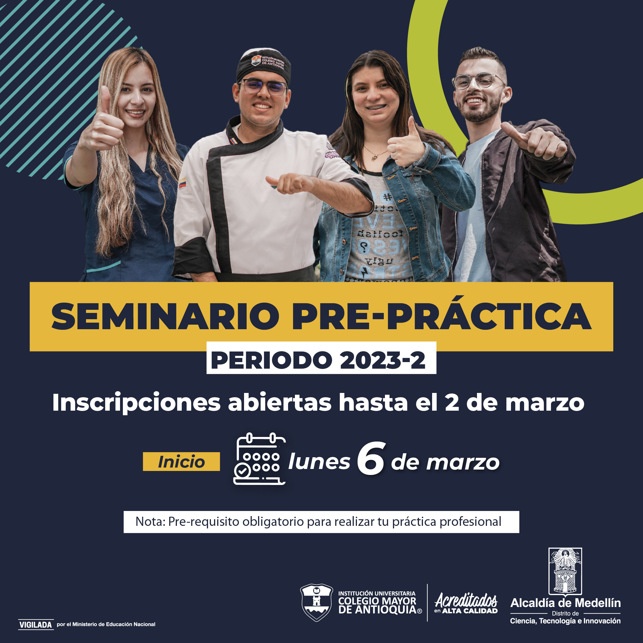 General Noticias Seminario pre-práctica , pre requisito obligatorio para realizar tu práctica laboral febrero 10, 2023. Conoce los horarios.