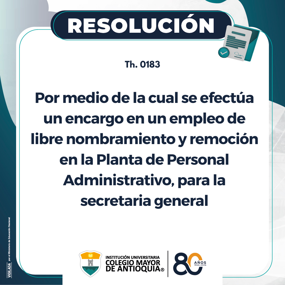 Comunicados General Noticias Resolución TH 0183: Por medio de la cual se efectúa un encargo en un empleo de libre nombramiento y remoción en la Planta de Personal Administrativo, para la secretaria general agosto 5, 2025. Conoce la resolución.