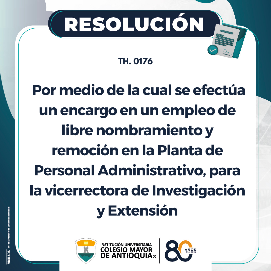 Comunicados General Noticias Resolución TH 0176: Por medio de la cual se efectúa un encargo en un empleo de libre nombramiento y remoción en la Planta de Personal Administrativo, para la vicerrectora de Investigación y Extensión julio 31, 2025. Conoce la resolución.