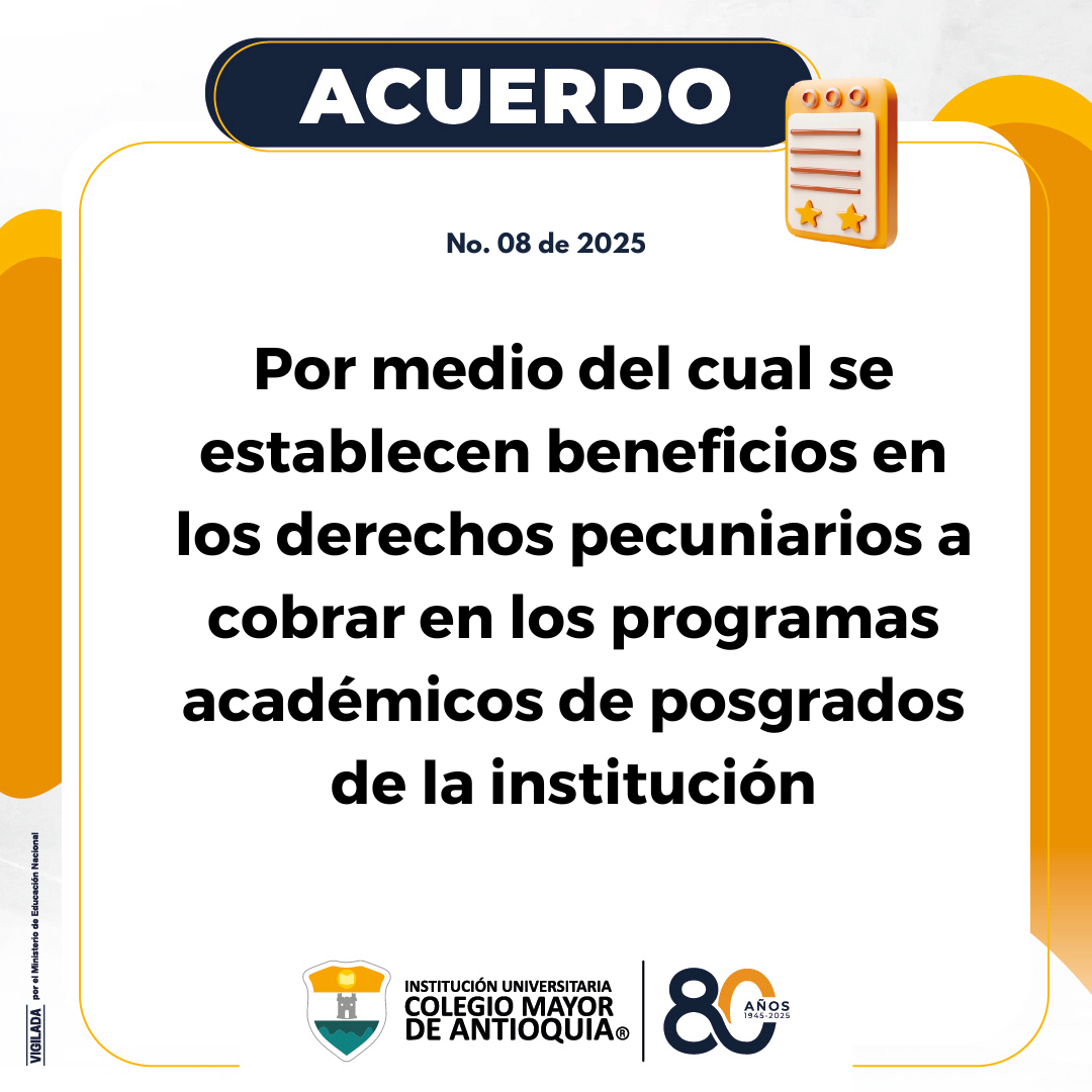 Comunicados General Noticias Acuerdo 08 de 2025: Por medio del cual se establecen beneficios en los derechos pecuniarios a cobrar en los programas académicos de posgrados de la institución agosto 4, 2025. Conoce el acuerdo.