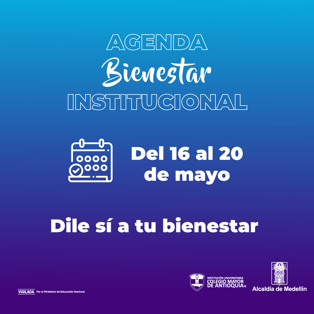 Agenda Bienestar Bienestar General Noticias Agéndate con Bienestar Institucional del 16 al 20 de mayo mayo 13, 2022. Agéndate y vela por tu bienestar.