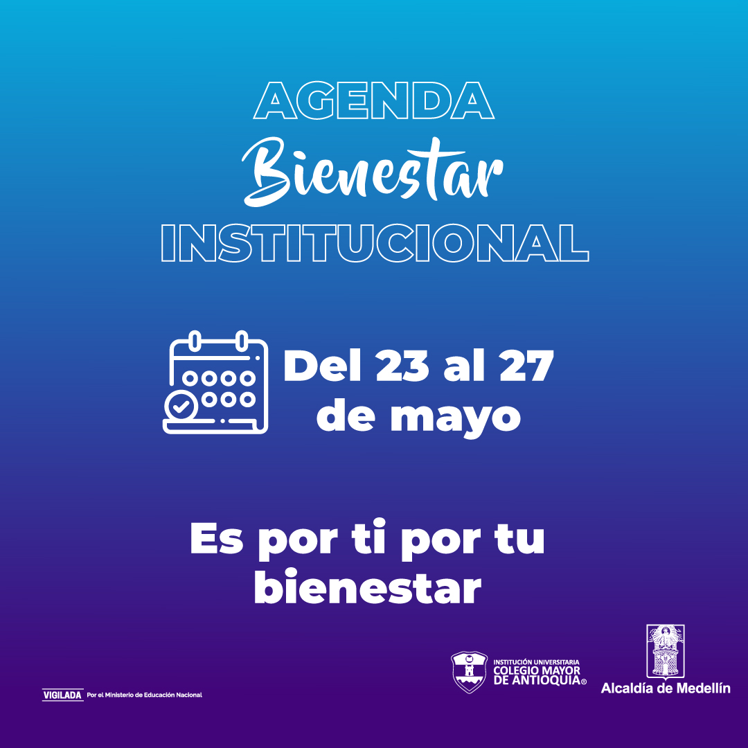 Agenda Bienestar Bienestar General Noticias Agéndate con Bienestar Institucional del 23 al 27 de mayo mayo 19, 2022. Agéndate y vela por tu bienestar.
