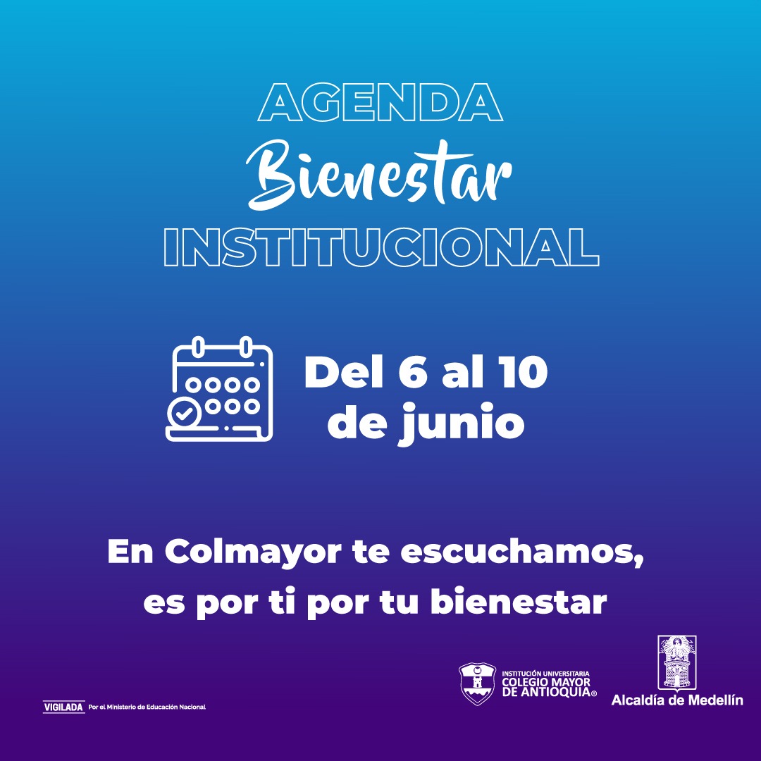 Agenda Bienestar Bienestar General Noticias Agéndate con Bienestar Institucional del 6 al 10 de junio junio 3, 2022. Agéndate y vela por tu bienestar.
