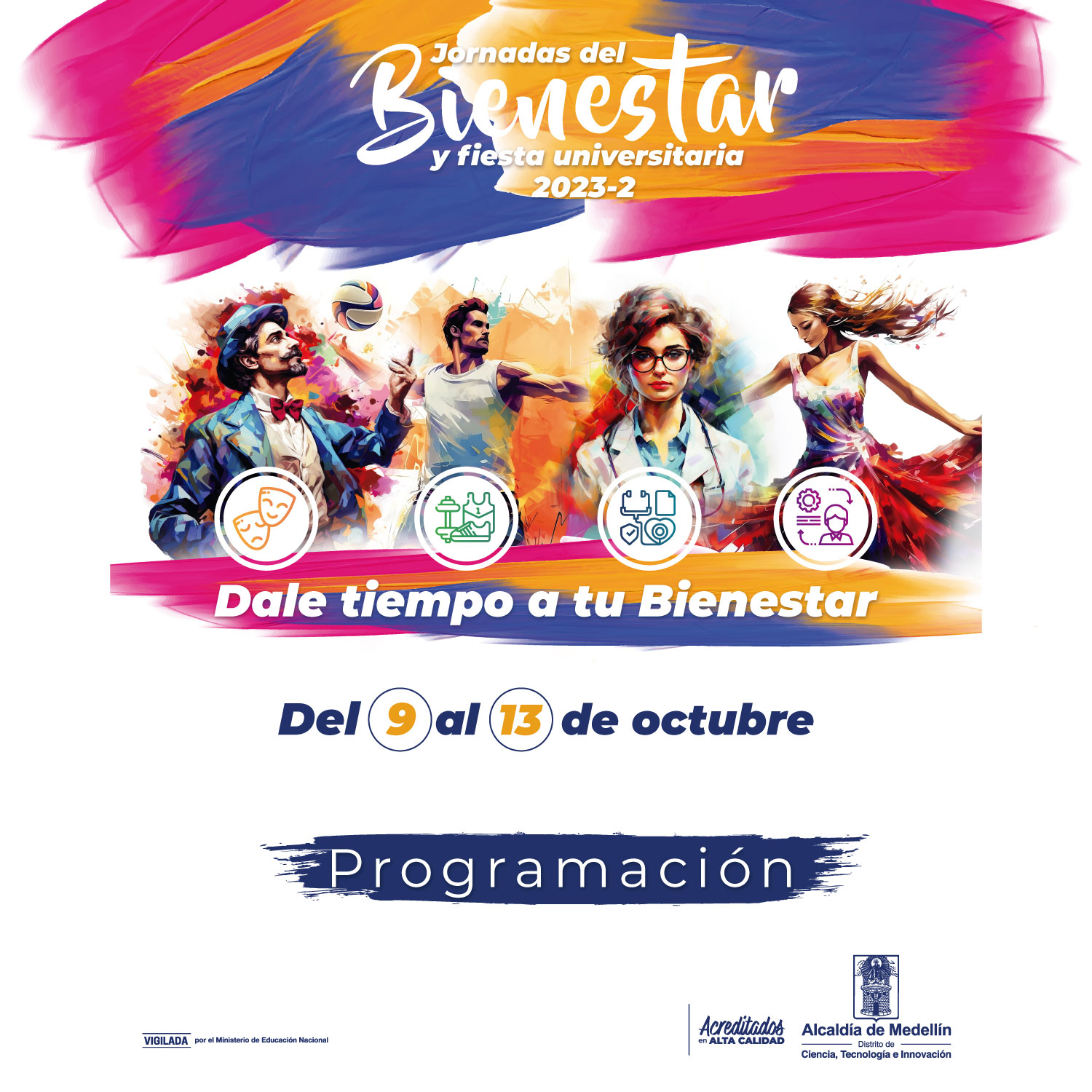 Agenda Bienestar Bienestar Facultades General Noticias Programación Jornadas del Bienestar y Fiesta Universitaria 2023-2 octubre 6, 2023. Conócela y prográmate.