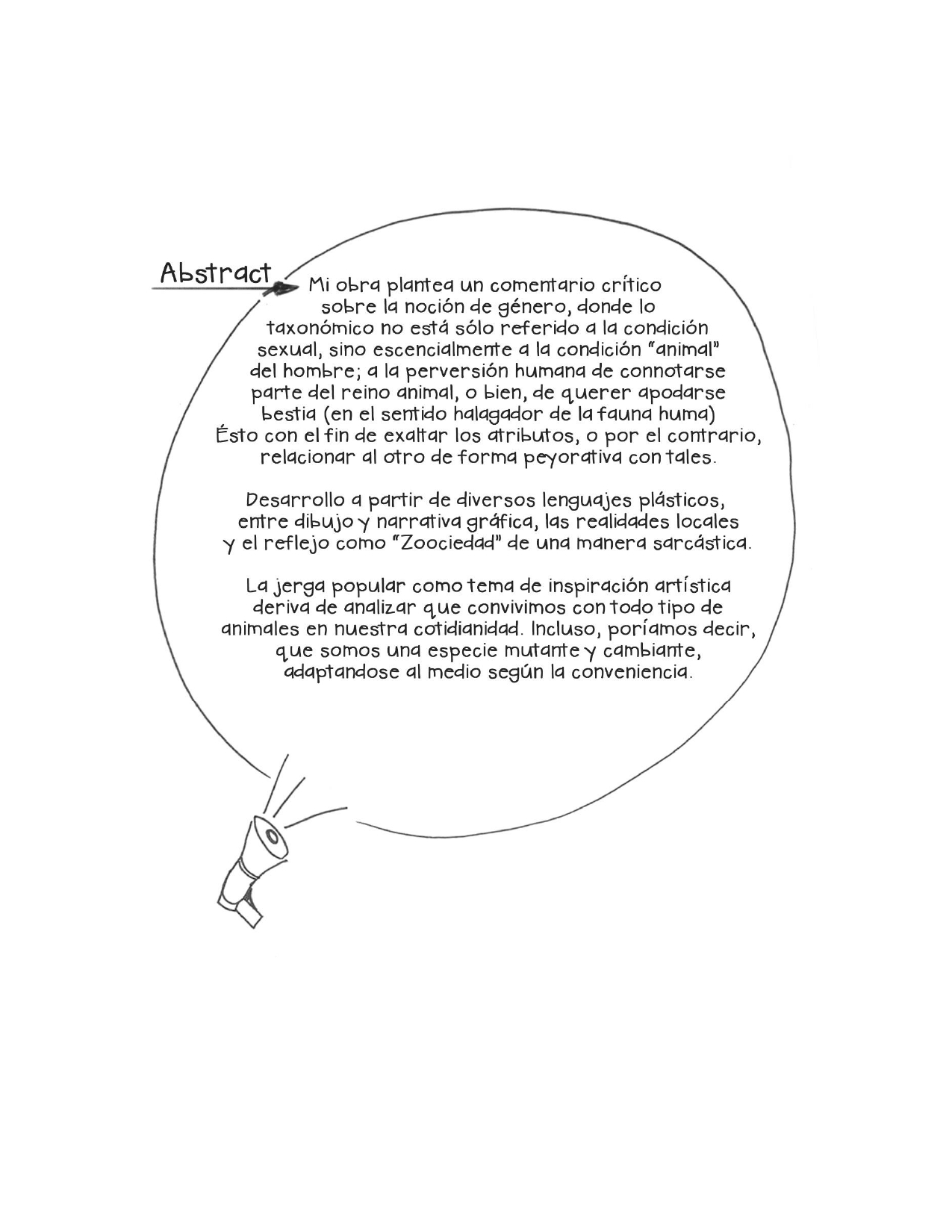 Cabe mencionar que el uso del parlache sexual como tema de inspiración artística deriva de analizar que convivimos con todo tipo de animales en nuestra cotidianidad, incluso podríamos decir que somos una especie animal. Además, en el mundo animal existe una variedad de especies con distintas características, el hombre se ha percatado y apropiado de ellas, se comienza a comportar como un ave rapaz, toma forma de perro y hasta de insecto. La finalidad del presente proyecto es la creación de imágenes, que desde el lenguaje del dibujo y acompañado de algunos textos se apropien de los juegos de palabras sexuales con los que mi generación suele denominar los comportamientos, interrelaciones y apariencias humanas. Propongo hacer un estudio etnográfico en el que, con participación de individuos de la ciudad. Se determinen analogías jergales comunes del tema en cuestión, lo que permitirá crear obras con la gente y para la gente.