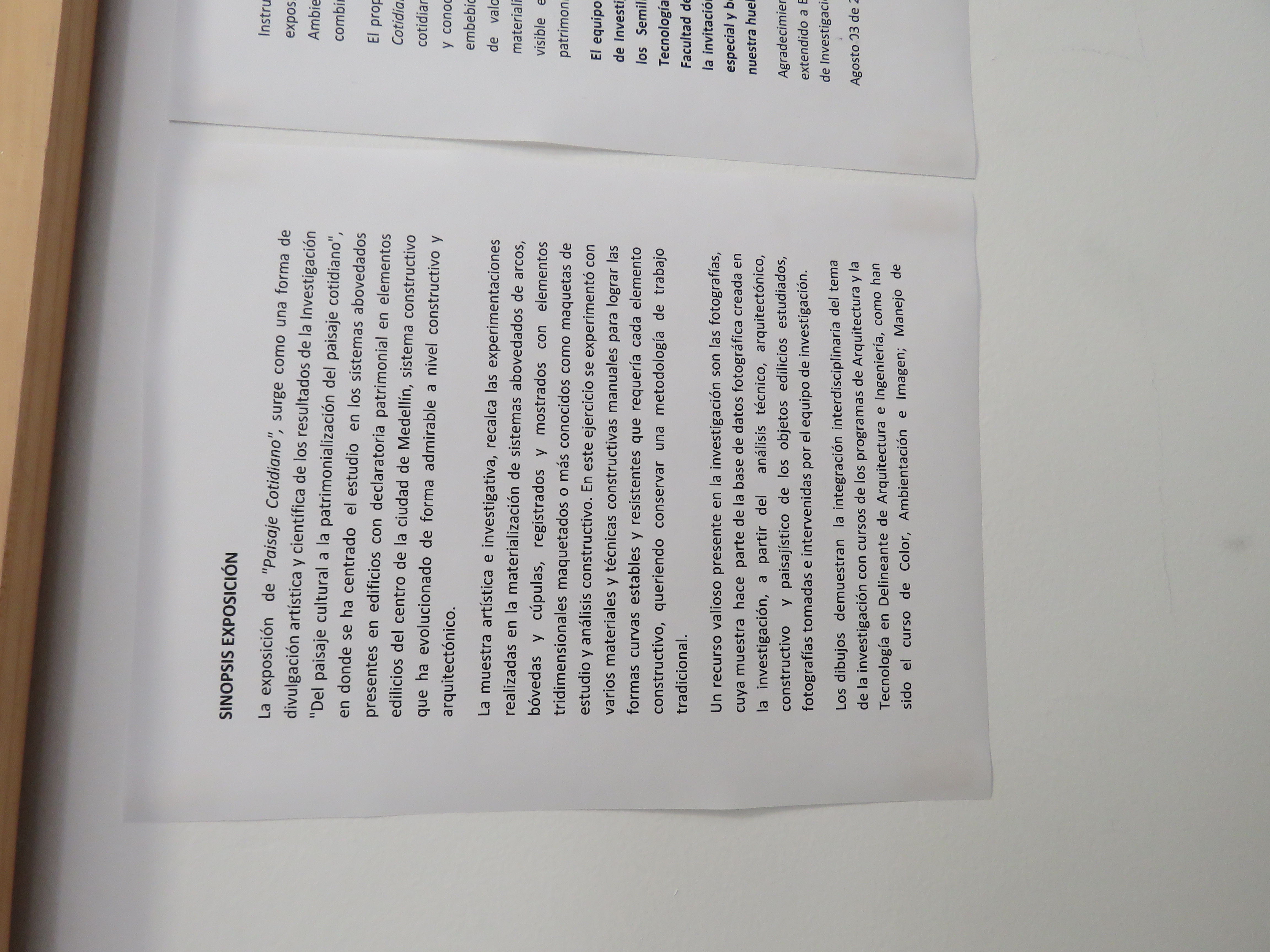 La exposición de “Paisaje Cotidiano”, surge como una forma de divulgación artística y científica de los resultados de la investigación “Del paisaje cultural a la patrimonialización del paisaje cotidiano”, en donde se ha centrado el estudio en los sistemas abovedados presentes en edificios con declaratoria patrimonial en elementos edilicios del centro de la ciudad de Medellín, sistema constrictivo que ha evolucionado de forma admirable a novel constructivo y arquitectónico.