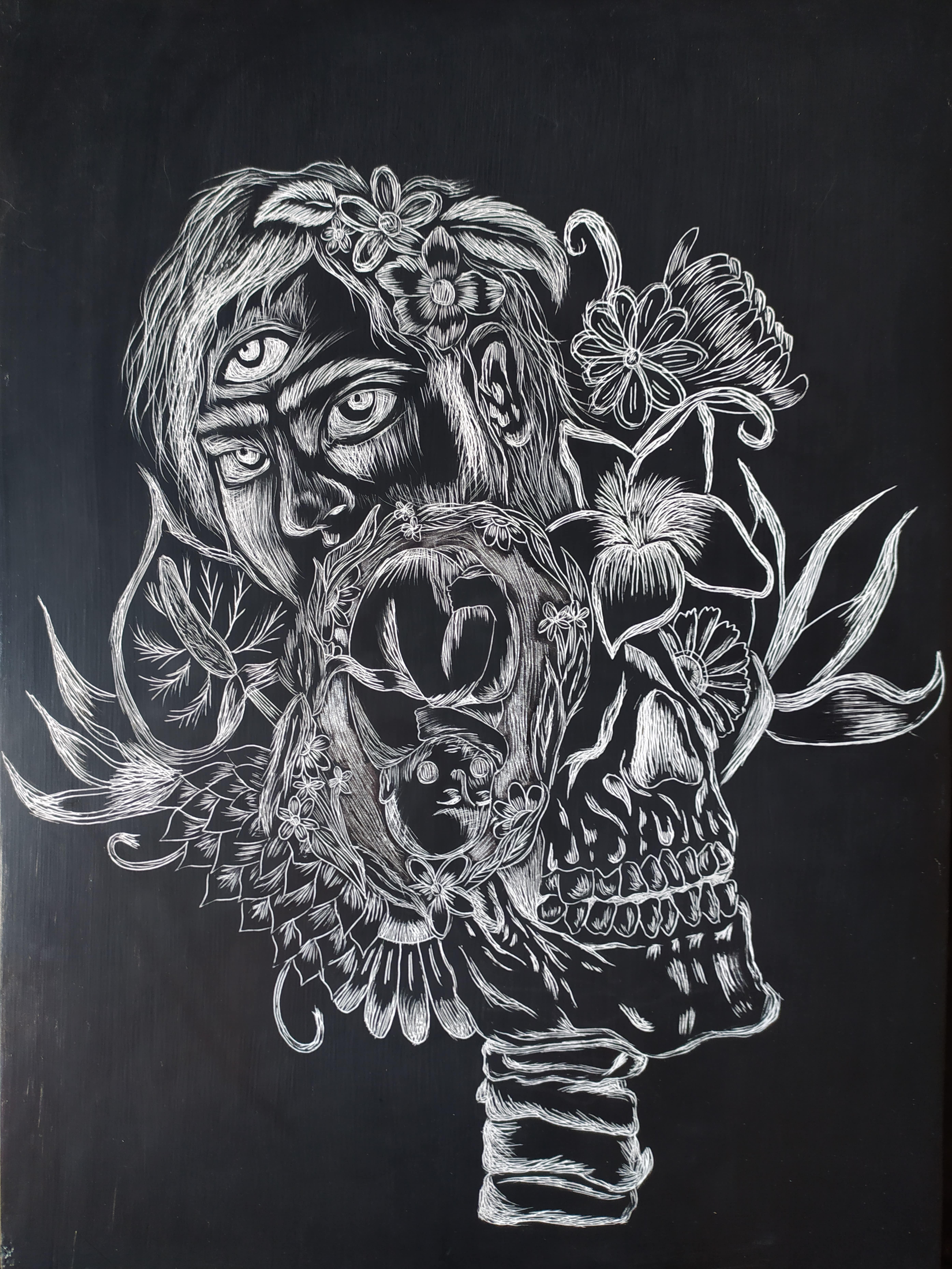 Con la zozobra dibujada en su rostro abrió las pesadas puertas de madera; estas sostenidas por inmensas bisagras de hierro que iban acompañadas de una platina forjada que se extendía por los bordes de ambas alas; manteniendo una singular sincronía que hacía juego con las paredes, de las cuales se resaltaban bloques de ladrillo; haciendo del diseño la fachada mas antigua y conservada del lugar. Al cruzarse por el comedor, continuó motivada hacia el gran salón que llevaba en dirección a la habitación matrimonial. Contaba entre pasos cada baldosa y mientras lo hacía pensaba en el arduo trabajo de quien hubiese colocado piezas tan grandes sin milímetro de error. Pero ese no era el momento, sabía que tenía una inequívoca intuición, tanto así que, encontraría sin falla a su futuro esposo con su desnuda figura puesta sobre otra piel. Como si la escena en su cabeza fuera solo el inicio, se abrió paso entre las cortinas moradas que tendían de unos ventanales con vidrios del mismo color; los cuales se encargaban de mantener la apariencia asfixiante del lugar. Entonces, movía con violencia y desesperación cada pedazo de tela hasta encontrarse con la puerta. Deslizó el cerrojo con la armonía que la caracterizaba y de forma muy cuidadosa se introdujo en el cuarto oscuro. Escuchó murmullos al instante, trató de encontrar una vela y en el intento desesperado arrancó el candelabro que colgaba de la pared. Lo sostuvo fuerte y se balanzó contra la cama.