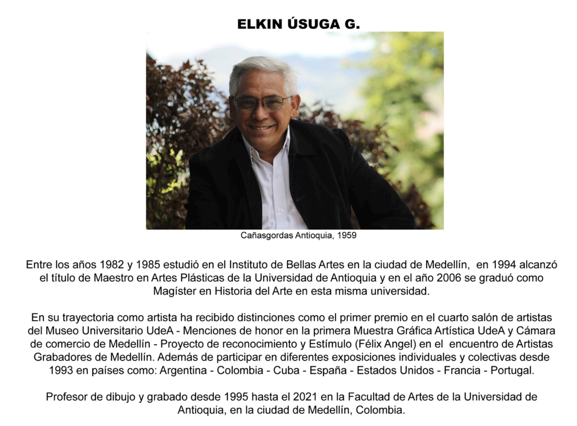 ¿Cuándo o en qué momento, comienza a hacerse artista, o cuando o en qué momento conoce el mundo del arte? Nadie lo sabe. Es una intuición o un instinto estético (F. Nietzschte) el que puede llevarle al arte, o que le ha llevado al arte,  desde una sensibilidad que le es dada o que tiene que darse. Y de la misma manera, hacer conciencia de la necesidad de ese mismo artista o no, para el arte, de cómo será su vida y su destino en el arte y como artista. Decide entonces serlo, llamarse así, con las dudas que también tiene el llamarse a sí mismo, artista o que lo llamen así. Duda total que se mueve entre lo que hace, como entre lo que lo hace, es como esa insaciable e irresoluble medida, en que se es artista o no, o se conoce el arte o no, es allí donde, como hemos dicho se mantiene instalado Elkin Úsuga, a quién conoceremos aquí, en esta muestra, que ha llamado: De lo transversal: Dibujos y grabados.