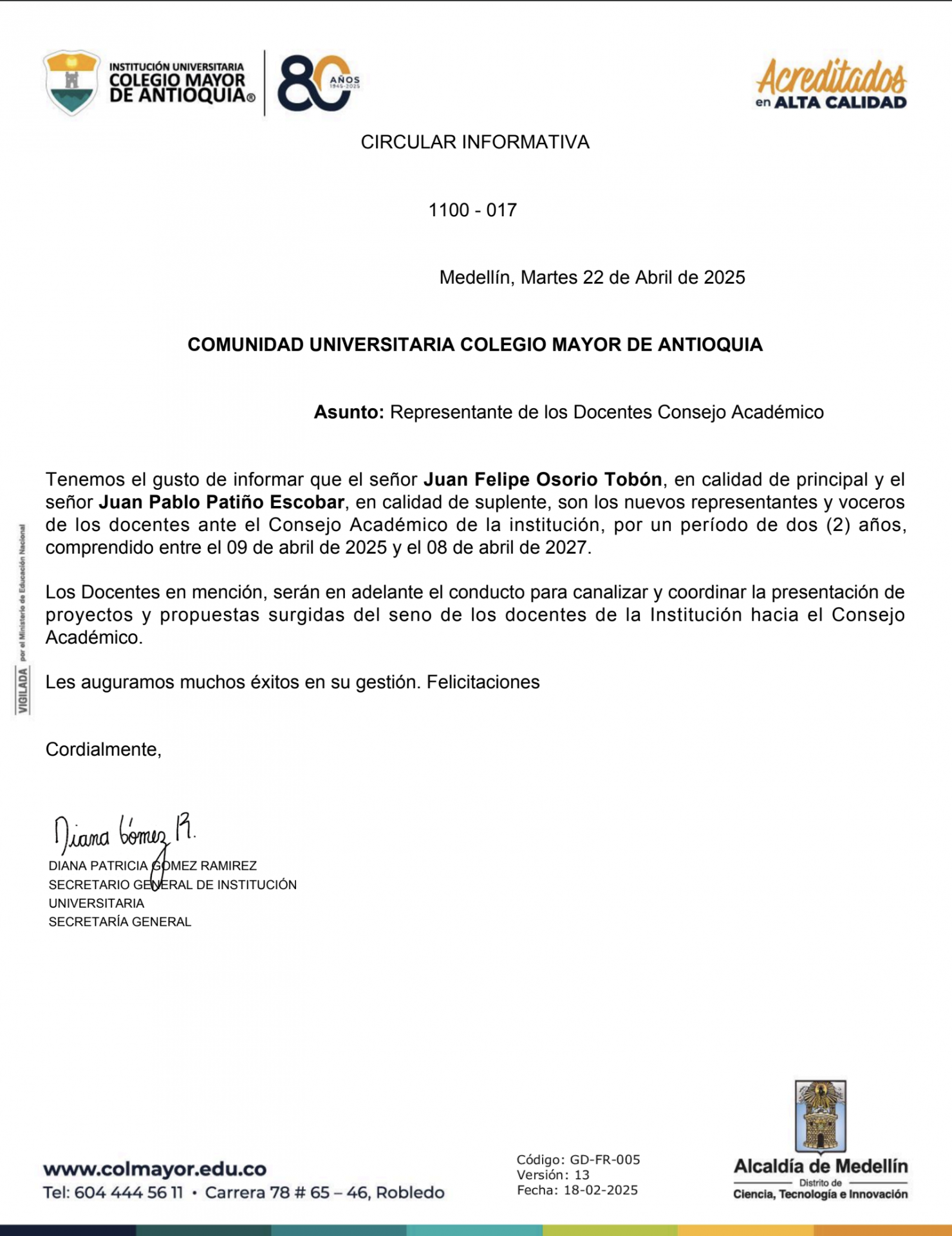 Nuevos representantes y voceros de los docentes ante el Consejo Académico de la institución Circular informativa abril 22, 2025. Haz clic aquí para conocer la circular Anterior Siguiente