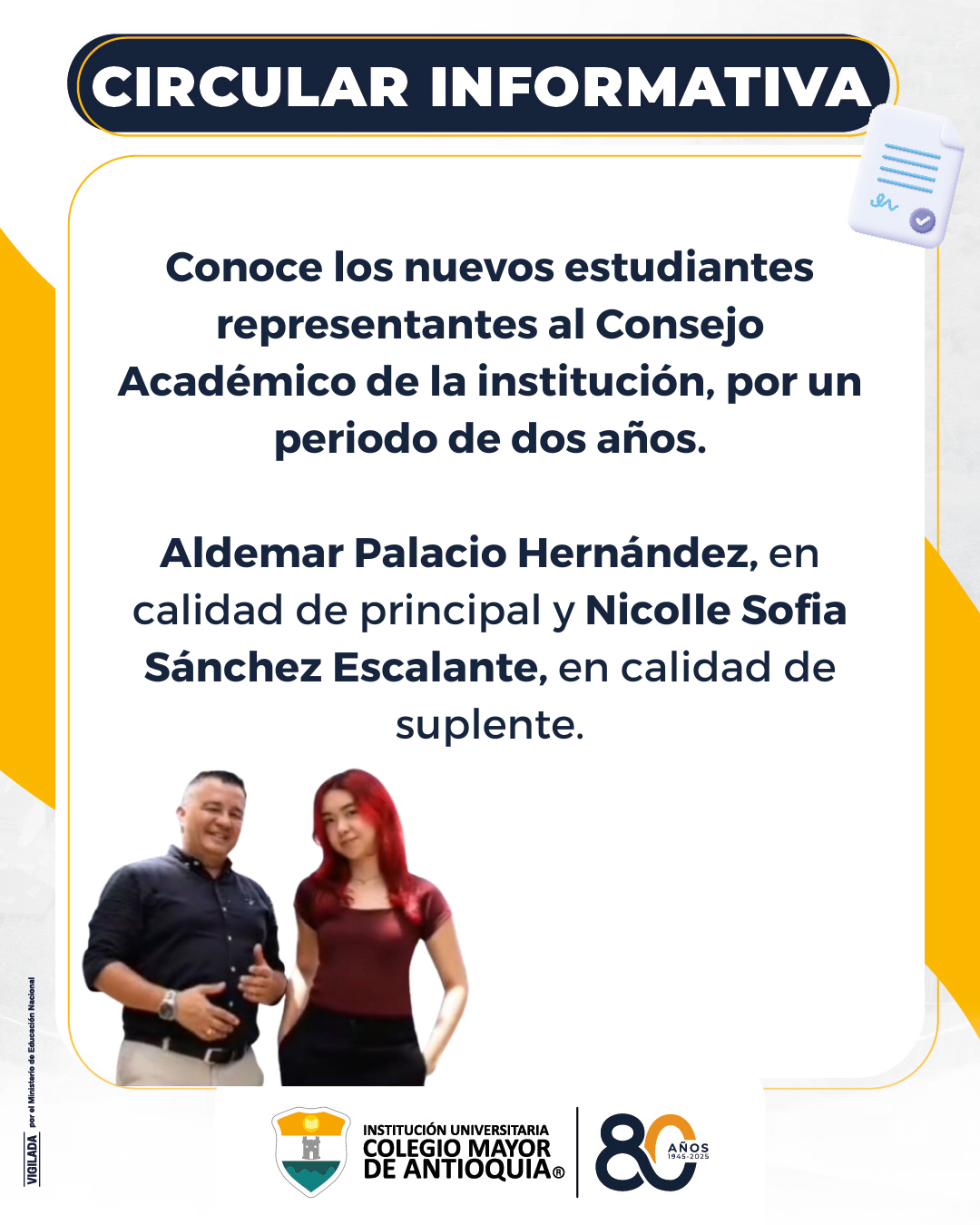 Conoce los nuevos estudiantes representantes ante el Consejo Académico de la institución Comunicados abril 16, 2026. Haz clic aquí para conocer la circular Anterior Siguiente