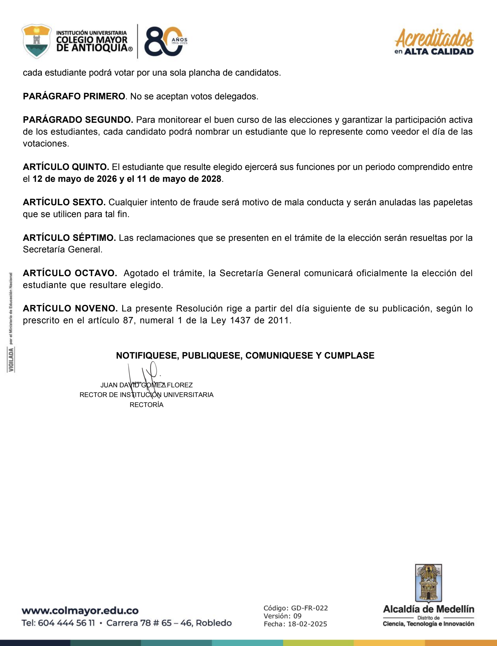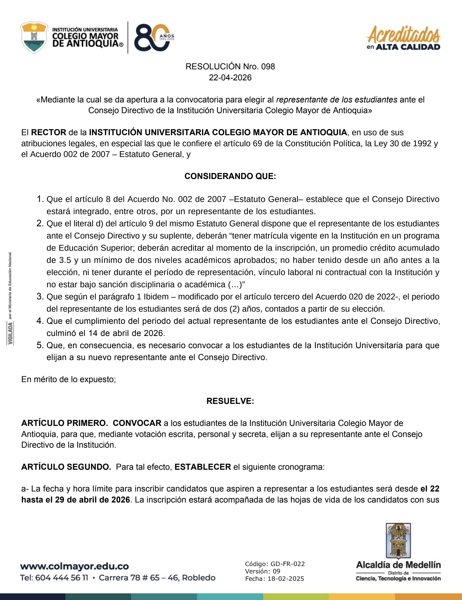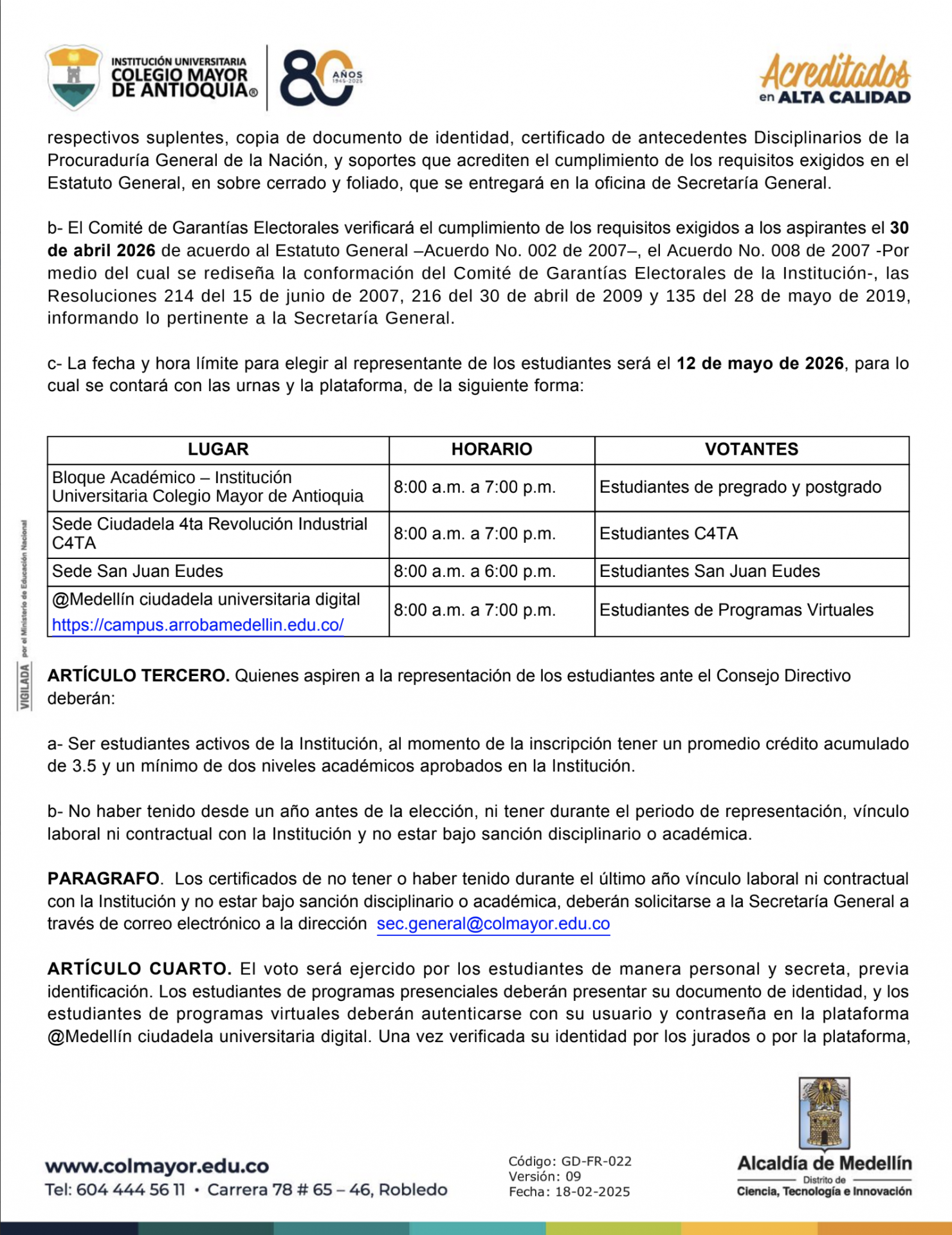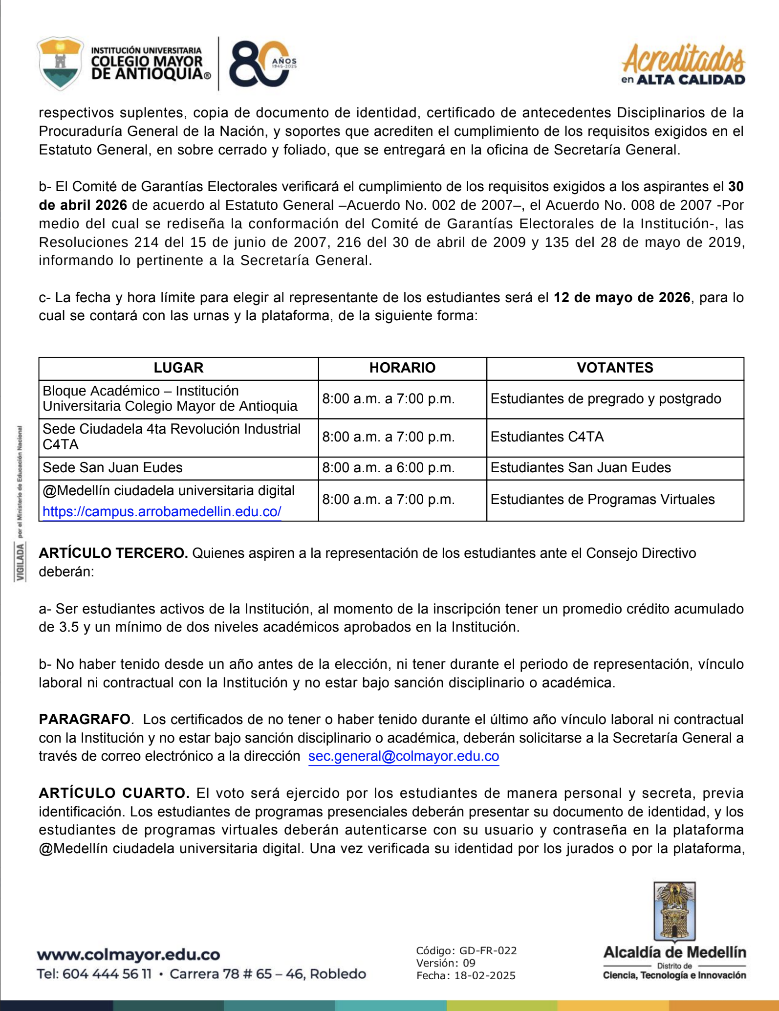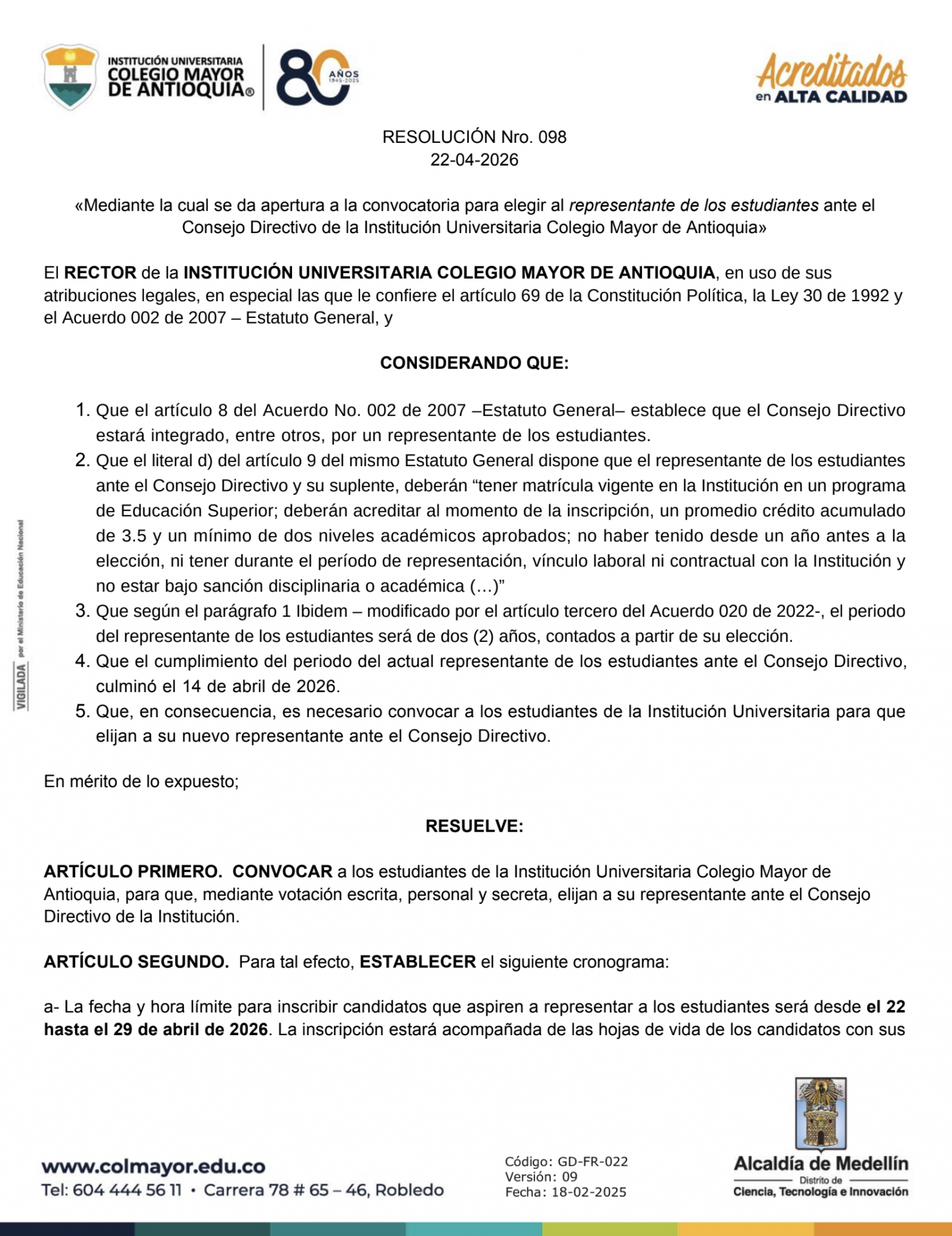 InicioActualidadComunicadosConvocatoria de elección del representante de los estudiantes ante el Consejo Directivo de la Institución