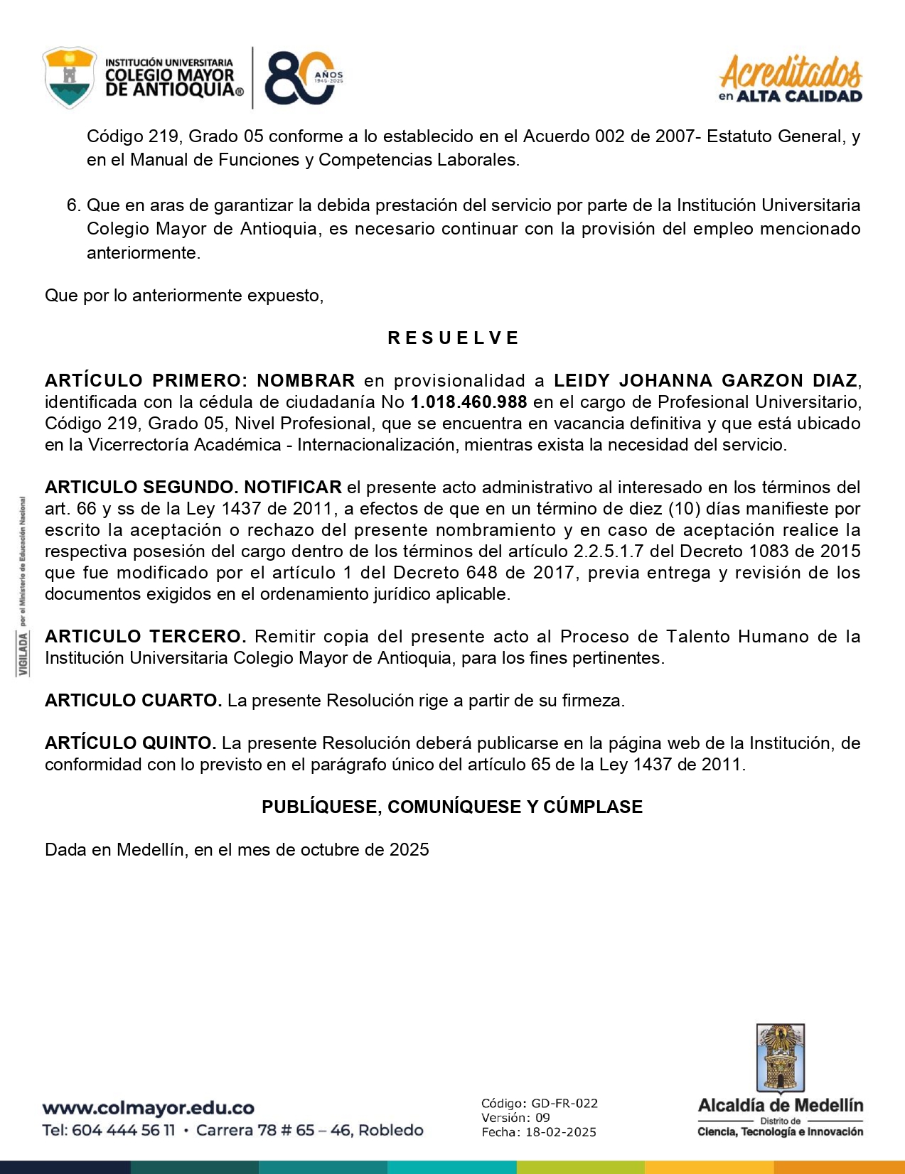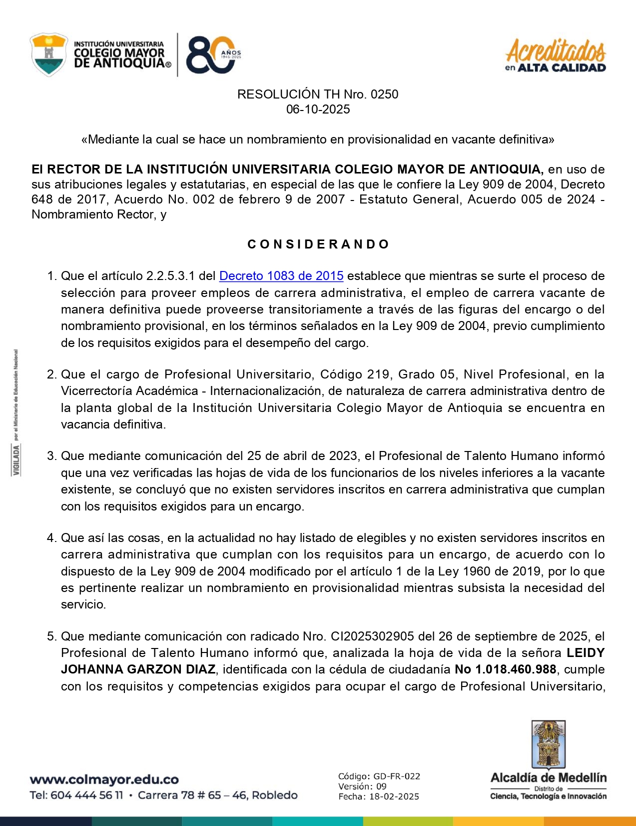Resolución TH Nro. 0250: Nombramiento en provisionalidad en vacante definitiva Comunicados octubre 8, 2025. Haz clic aquí para descargar la resolución Anterior