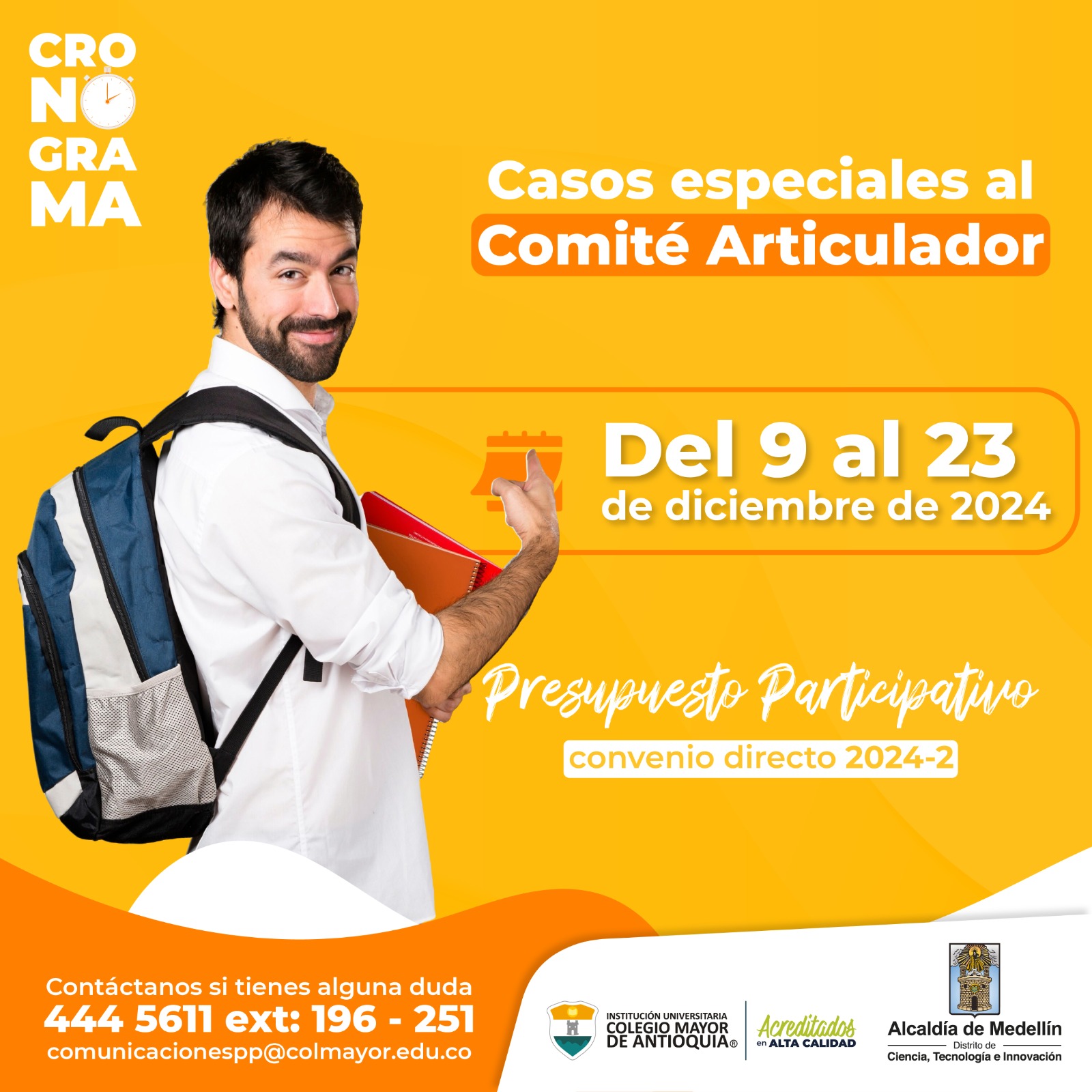 Apreciado estudiante, desde la oficina de Presupuesto Participativo de la Institución Universitaria Colegio Mayor de Antioquia, se elaboró el cronograma para las solicitudes al Comité Articulador, vigencia 2025-1, acorde al calendario académico, publicado en la página institucional por la Oficina de Admisiones, Registro y Control.