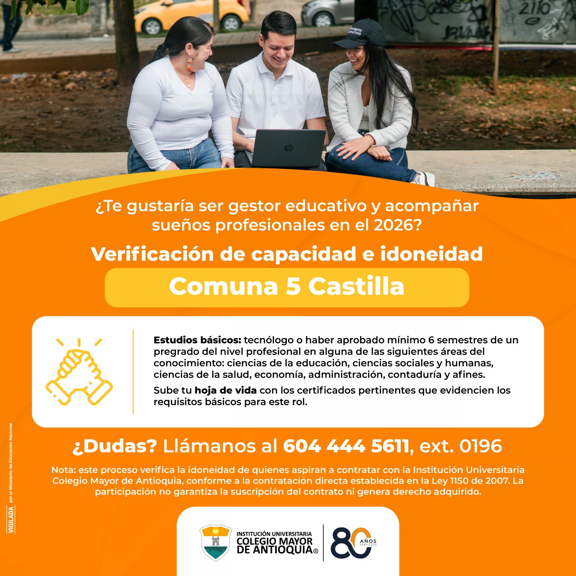 Si te gusta el trabajo comunitario, conoces muy bien la comuna 5 Castilla y eres un total convencido de que la educación aporta significativamente a la calidad de vida de las personas, participa de la verificación de capacidad e idoneidad para el rol de gestor o gestora educativa.