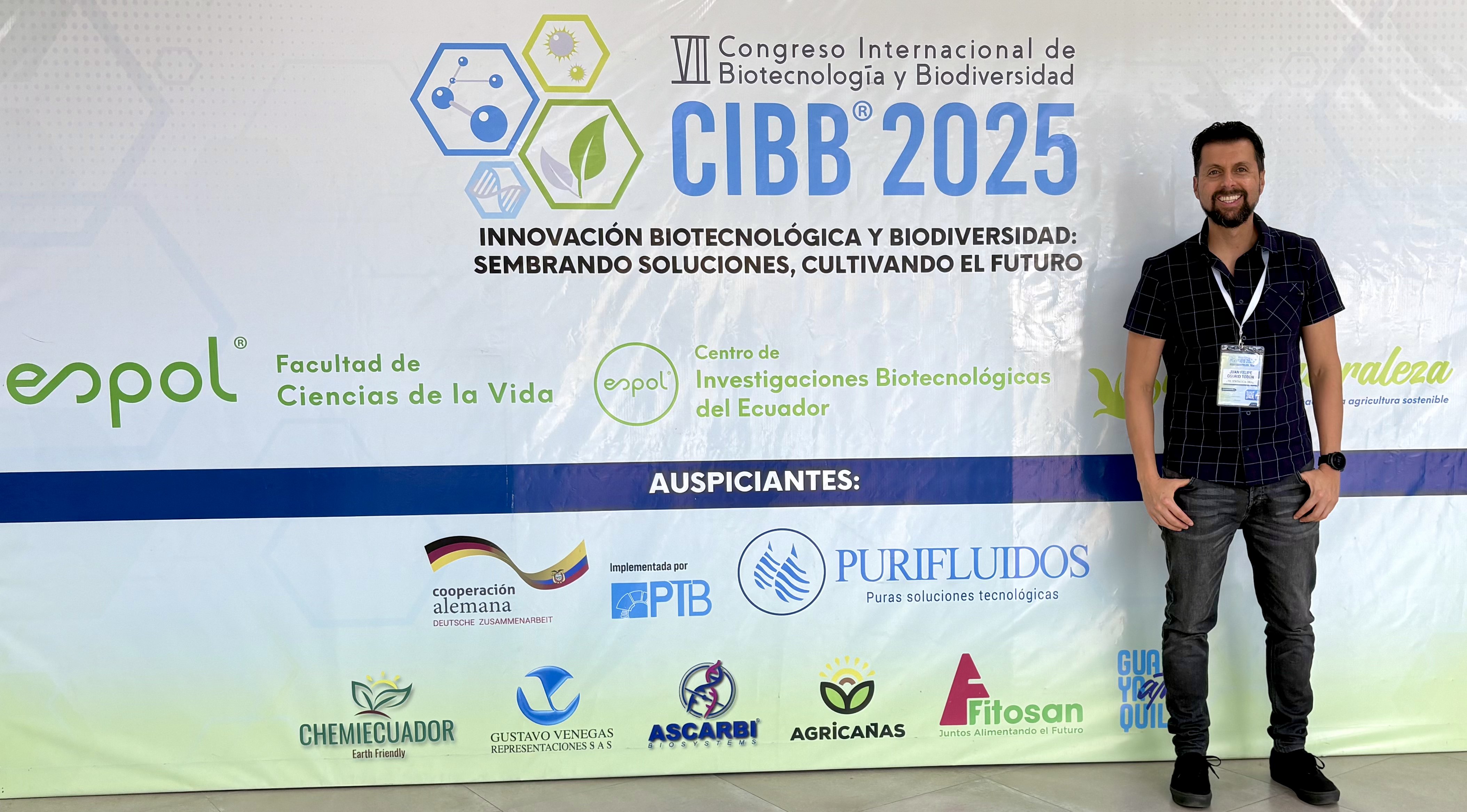 El docente investigador Juan Felipe Osorio Tobón, Ph. D., de la Facultad de Ciencias de la Salud de la Institución Universitaria Colegio Mayor de Antioquia, participó como ponente en el VII Congreso Internacional de Biotecnología y Biodiversidad (CIBB 2025), realizado del 6 al 9 de octubre en el Edificio STEM del campus Gustavo Galindo de la Escuela Superior Politécnica del Litoral (ESPOL), en Guayaquil, Ecuador.
