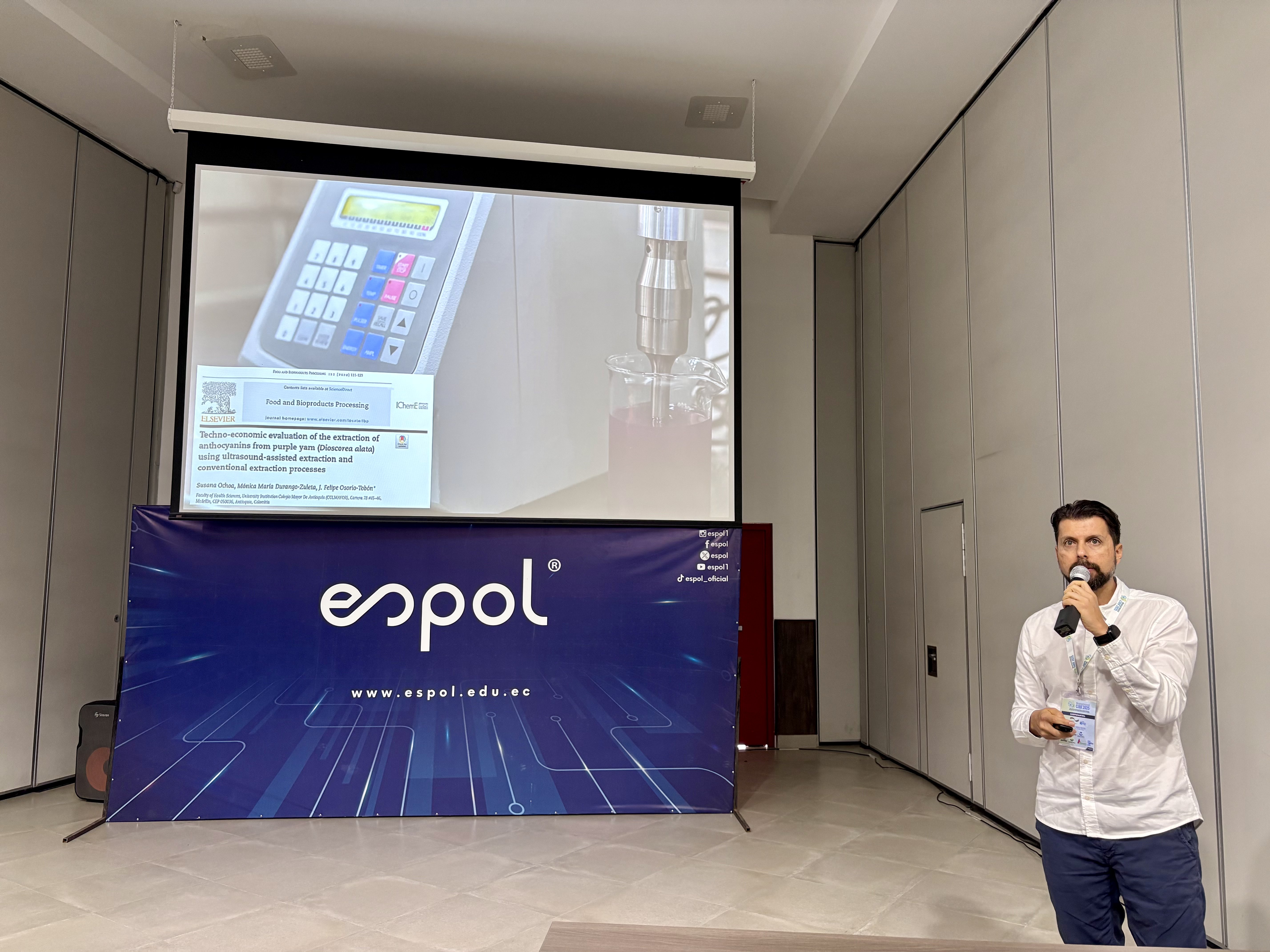 Durante el evento, el profesor Osorio presentó la ponencia titulada “Hidrólisis enzimática asistida por ultrasonido de almidón de ñame morado (Dioscorea alata) proveniente del residuo de extracción de antocianinas”, investigación que busca valorizar productos y residuos agroindustriales mediante su transformación en compuestos de alto valor agregado.
