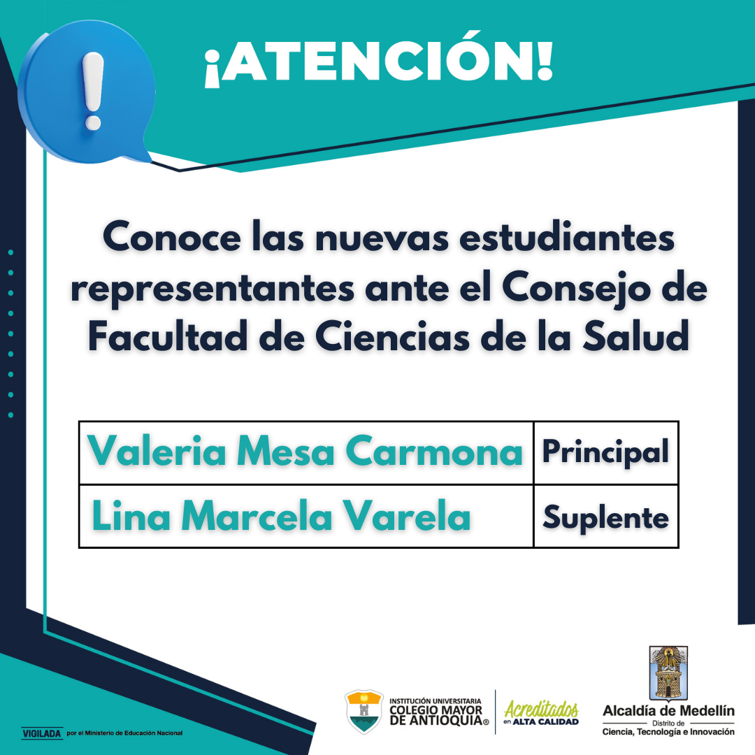 Convocatorias Facultades General Noticias Nuevas estudiantes representantes ante el Consejo de Facultad de Ciencias de la Salud octubre 25, 2023. Conoce la circular informativa.
