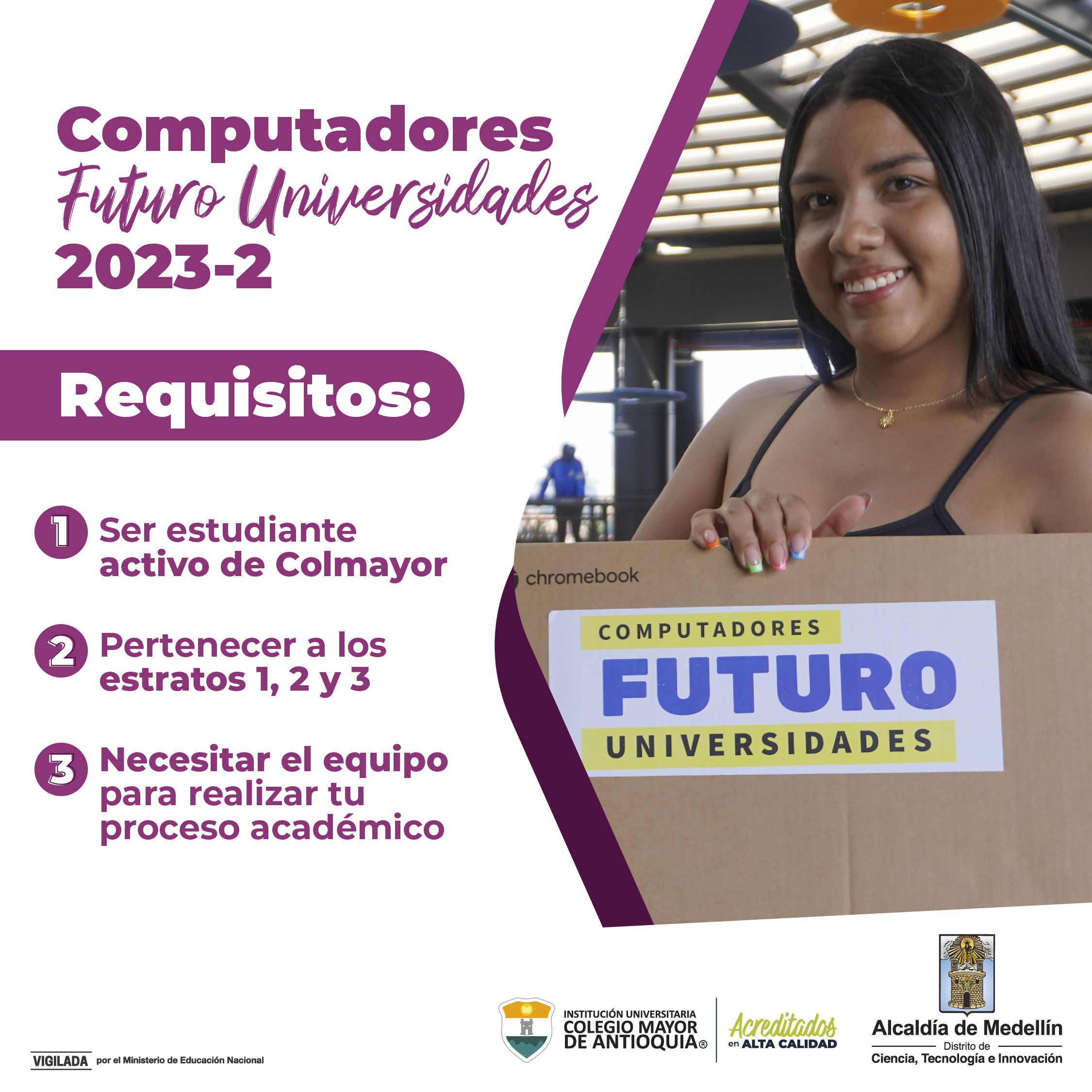 Bienestar Convocatorias Facultades General Noticias Convocatoria Computadores Futuro 2023-2 agosto 10, 2023. Conoce los requisitos para el préstamo de éstos.
