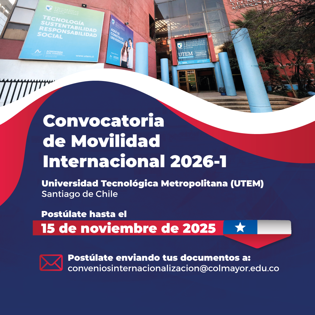 La Institución Universitaria Colegio Mayor de Antioquia invita a sus estudiantes a participar en la convocatoria de movilidad académica saliente 2026-1 con la Universidad Tecnológica Metropolitana (UTEM), ubicada en Santiago de Chile.
