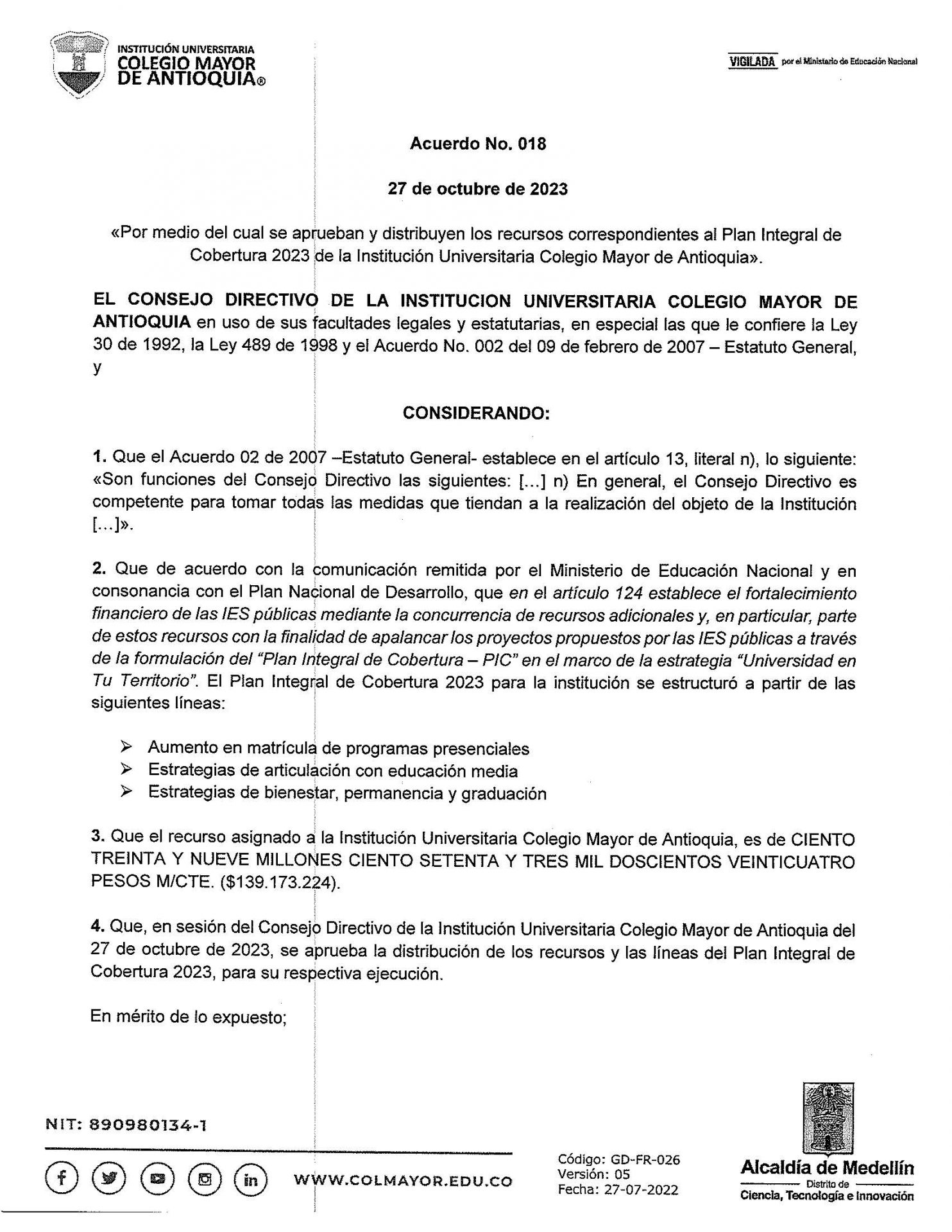 Aprobación y distribución de los recursos correspondientes al Plan Integral de Cobertura 2023 de la institución General noviembre 30, 2023. Haz clic aquí para conocer el acuerdo Anterior Siguiente