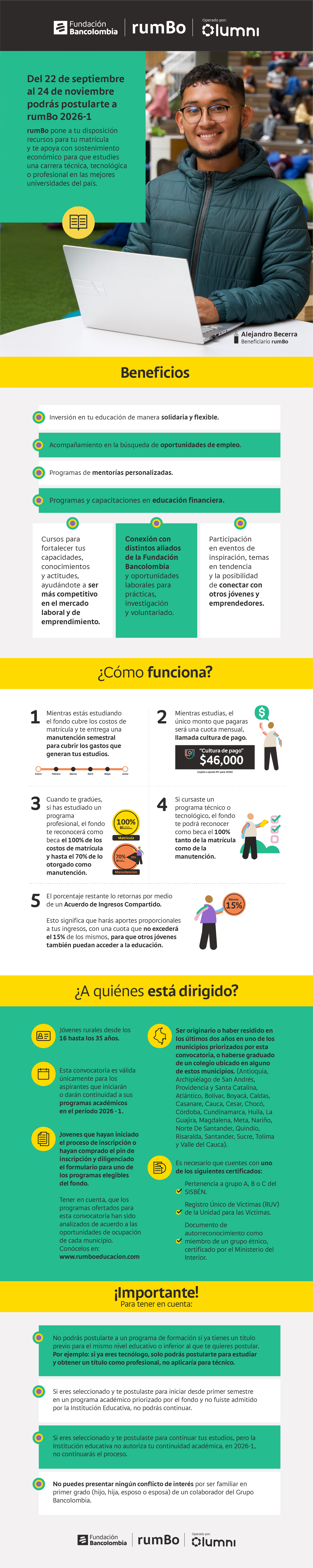 Convocatoria rumBo 2026 – Fundación Bancolombia General octubre 17, 2025. Conoce la convocatoria para 2026-1 Descarga y conoce aquí los términos y condiciones Departamentos y municipios priorizados Anterior