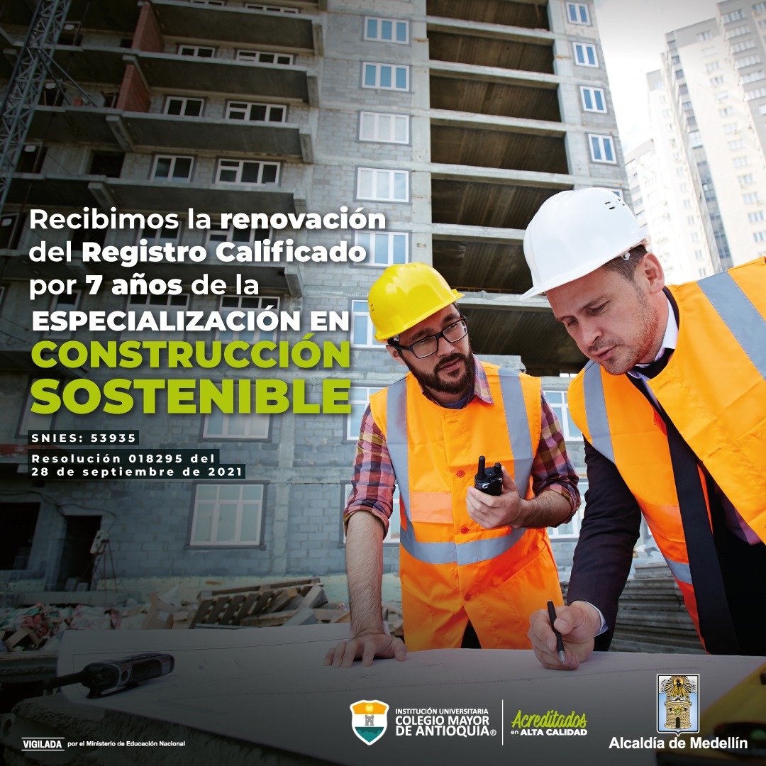 Por medio de la Resolución 018295 del 28 de septiembre de 2021, el Ministerio de Educación Nacional renueva el Registro Calificado por un término de 7 años al programa Especialización en Construcción Sostenible de la Facultad de Arquitectura e Ingeniería de nuestra institución.