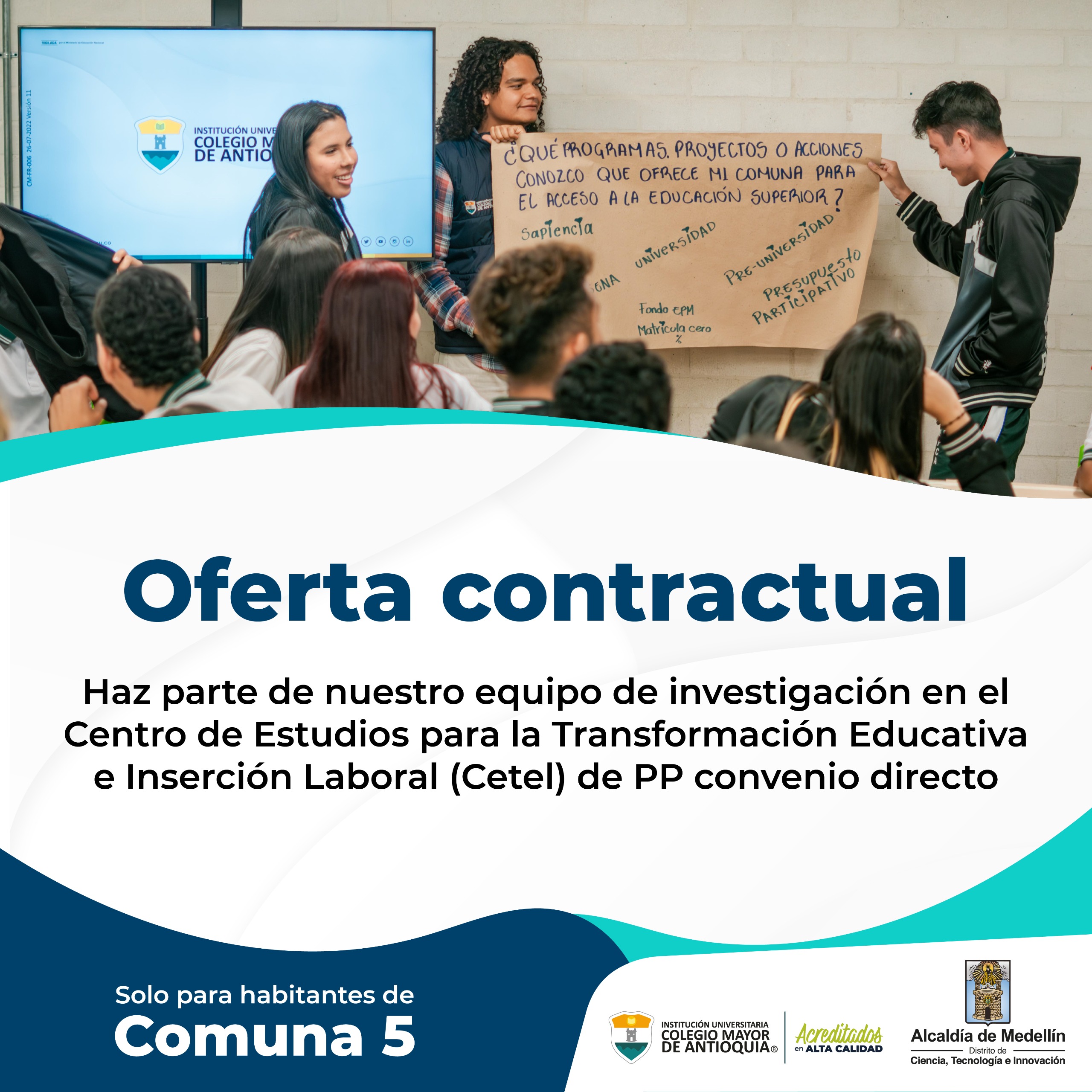 Convocatorias PP General Noticias Haz parte de nuestro equipo de investigación del Cetel – comuna 5 Castilla enero 23, 2024. Conoce los requisitos.