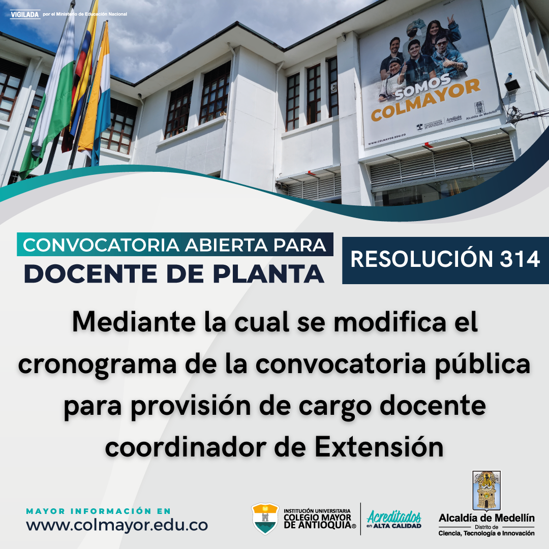 Convocatorias General Noticias Convocatoria abierta para una plaza docente de planta noviembre 8, 2022. Resolución 314: Mediante la cual se modifica el cronograma de la convocatoria pública para provisión de cargo docente coordinador de Extensión