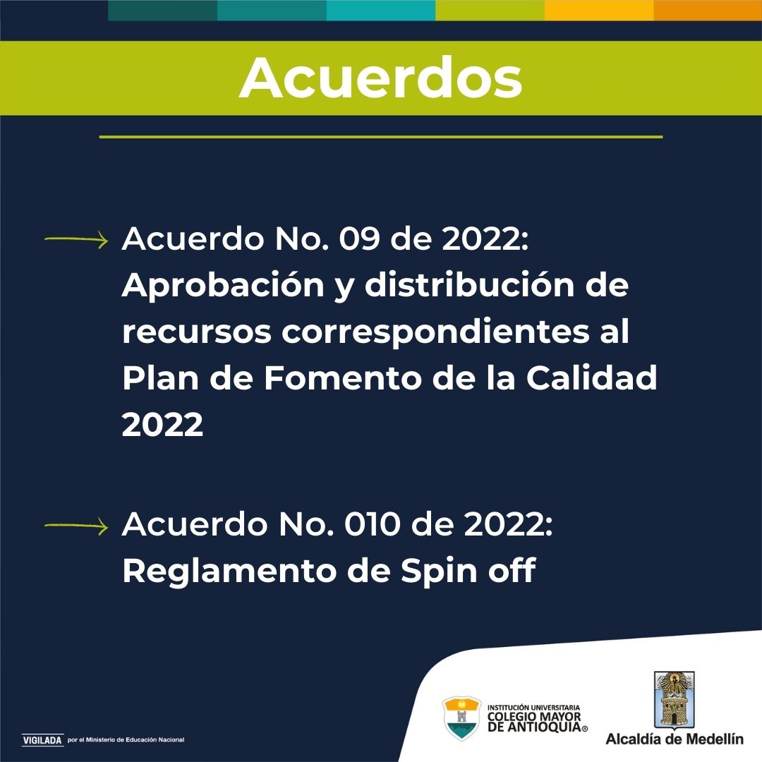 General Noticias Conoce los acuerdos 09 y 010 de la I.U. Colmayor de Antioquia junio 23, 2022. Aprobación y distribución de recursos correspondientes al Plan de Fomento de la Calidad 2022 y Reglamento de Spin off
