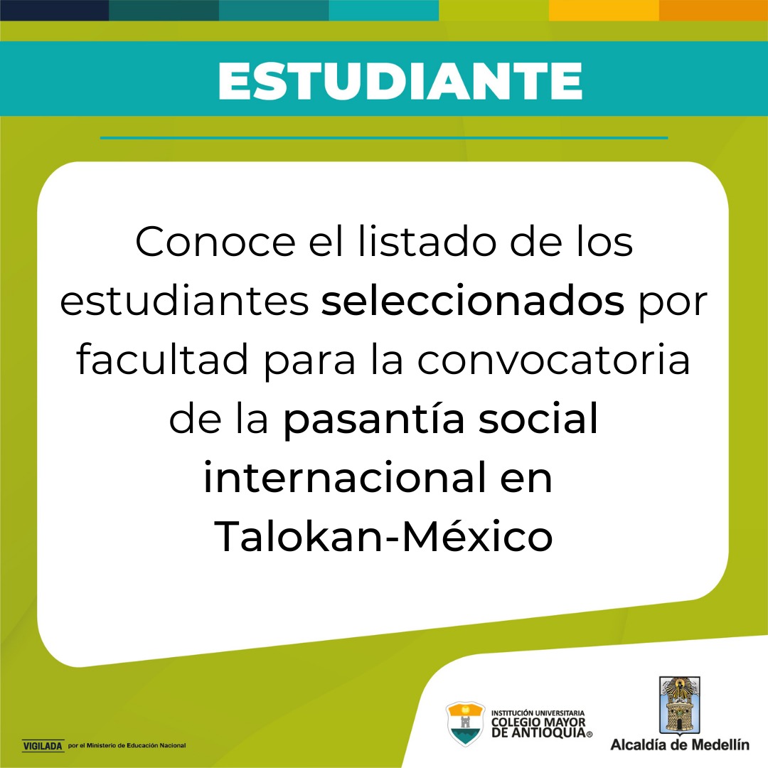 General Noticias Estudiantes seleccionados por facultad para las pasantías Colmayor-Talokan marzo 31, 2022. Conoce el listado.
