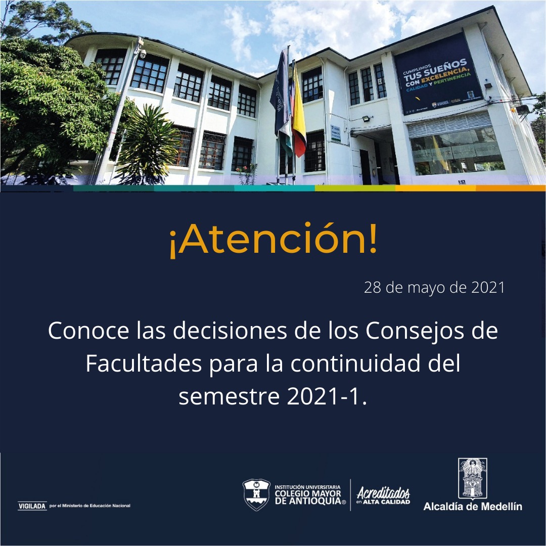 Facultades General Noticias Comunicado de las decisiones tomadas para la continuidad del semestre de los Consejos de Facultades mayo 28, 2021. Conoce los comunicados.