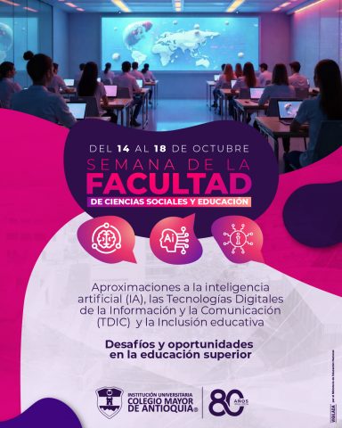 Del 14 al 18 de octubre de 2025, la Facultad de Ciencias Sociales y Educación del Colegio Mayor de Antioquia celebrará su tradicional Semana de Facultad, un espacio académico, cultural y reflexivo que reunirá a estudiantes, docentes, egresados e invitados nacionales e internacionales en torno a un tema central: “Aproximaciones a la inteligencia artificial (IA), las Tecnologías Digitales de la Información y la Comunicación (TDIC) y la Inclusión educativa: desafíos y oportunidades en la educación superior.”