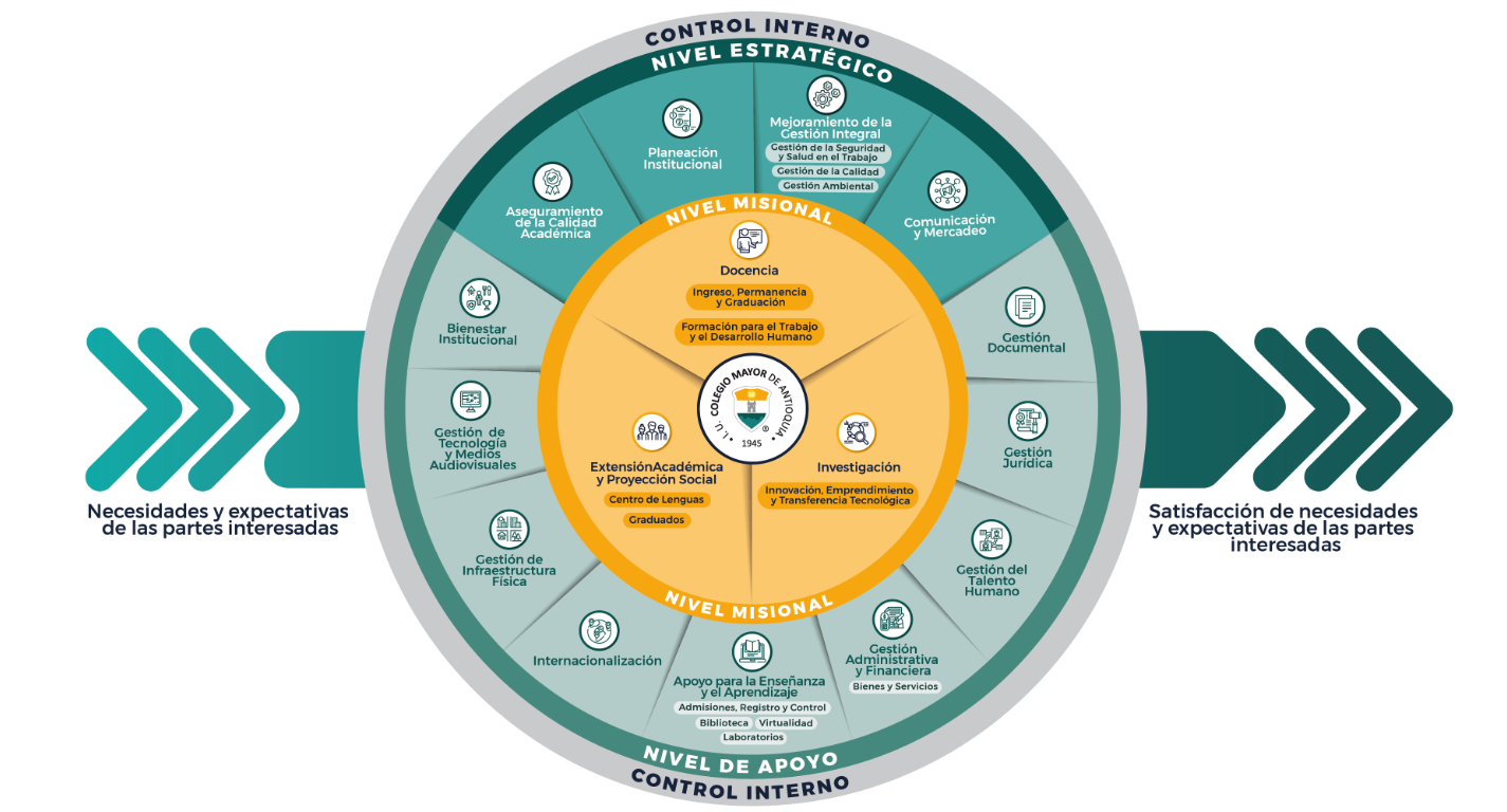 La Institución ha adoptado el Mapa de Procesos para esquematizar la interacción de los procesos que constituyen el Sistema de Gestión Integral y su interacción con la cadena de valor de los servicios que ofrece.