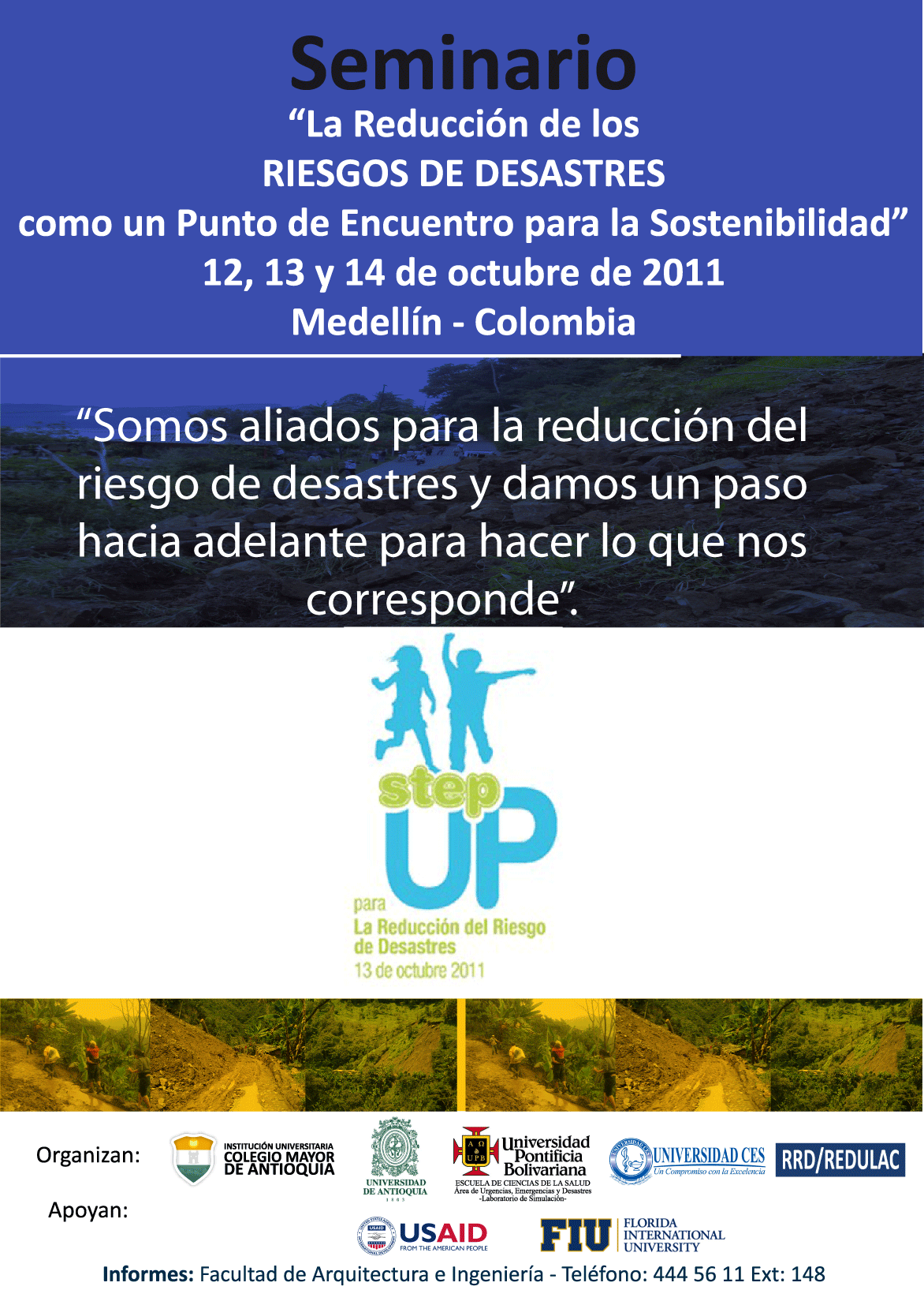 La Institución Universitaria Colegio Mayor de Antioquia, La Universidad de Antioquia, La Universidad Pontificia Bolivariana, la Universidad CES se unieron para realizar en Medellín los días 12, 13 y 14 de octubre, el Seminario Internacional "La Reducción de los Riesgos de Desastres como un Punto de Encuentro para la Sostenibilidad", este evento sirvió para reunir a 17 universidades que trabajan en Latinoamérica por la reducción del riesgo de desastres, así como la consolidación de un mensaje muy claro de continuar trabajando en torno al tema con gran responsabilidad para educar e informar a nuestros jóvenes estudiantes acerca del tema de la reducción del riesgo de desastres, un tema de tanta importancia, trascendencia y transversalidad.
