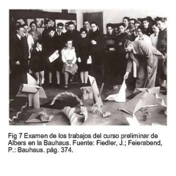 Albers, según relata uno de sus alumnos, Hannes Beckmann, entraba en la sala con un montón de periódicos bajo el brazo que mandaba repartir entre los estudiantes Señoras y señores, somos pobres, no ricos. No podemos permitirnos malgastar material ni tiempo. Debemos convertir lo peor en lo mejor. Cada obra de arte cuenta con un determinado material de partida y, por tanto, primero debemos investigar cómo está hecho este material. Para ello, primero deberemos experimentar, sin confeccionar nada. En estos momentos preferimos la habilidad a la belleza. Piensen que en general conseguirán más cuanto menos hagan.