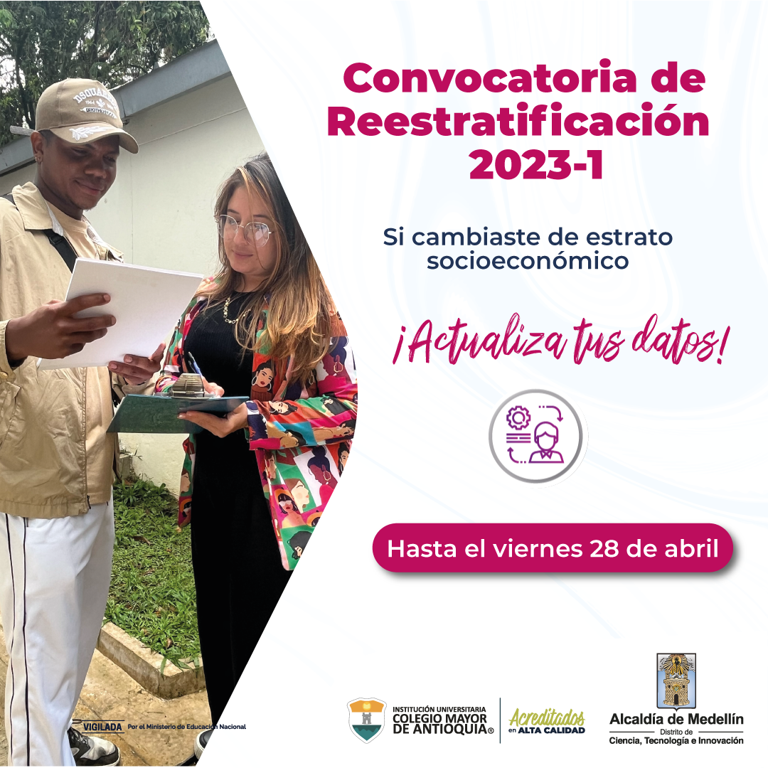 Bienestar Convocatorias General Noticias Convocatoria de Reestratificación 2023-1 marzo 22, 2023. Conoce los requisitos y actualiza tus datos.