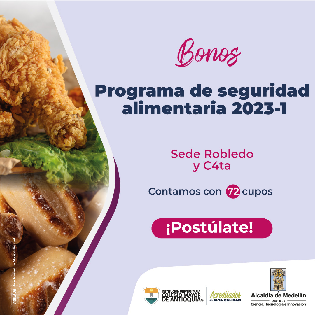 Bienestar Convocatorias General Noticias Bonos de auxilios alimentarios 2023-1 marzo 8, 2023. para programas de pregrado virtuales o de las sedes desconcentradas: comunas 1, 3 y 6.