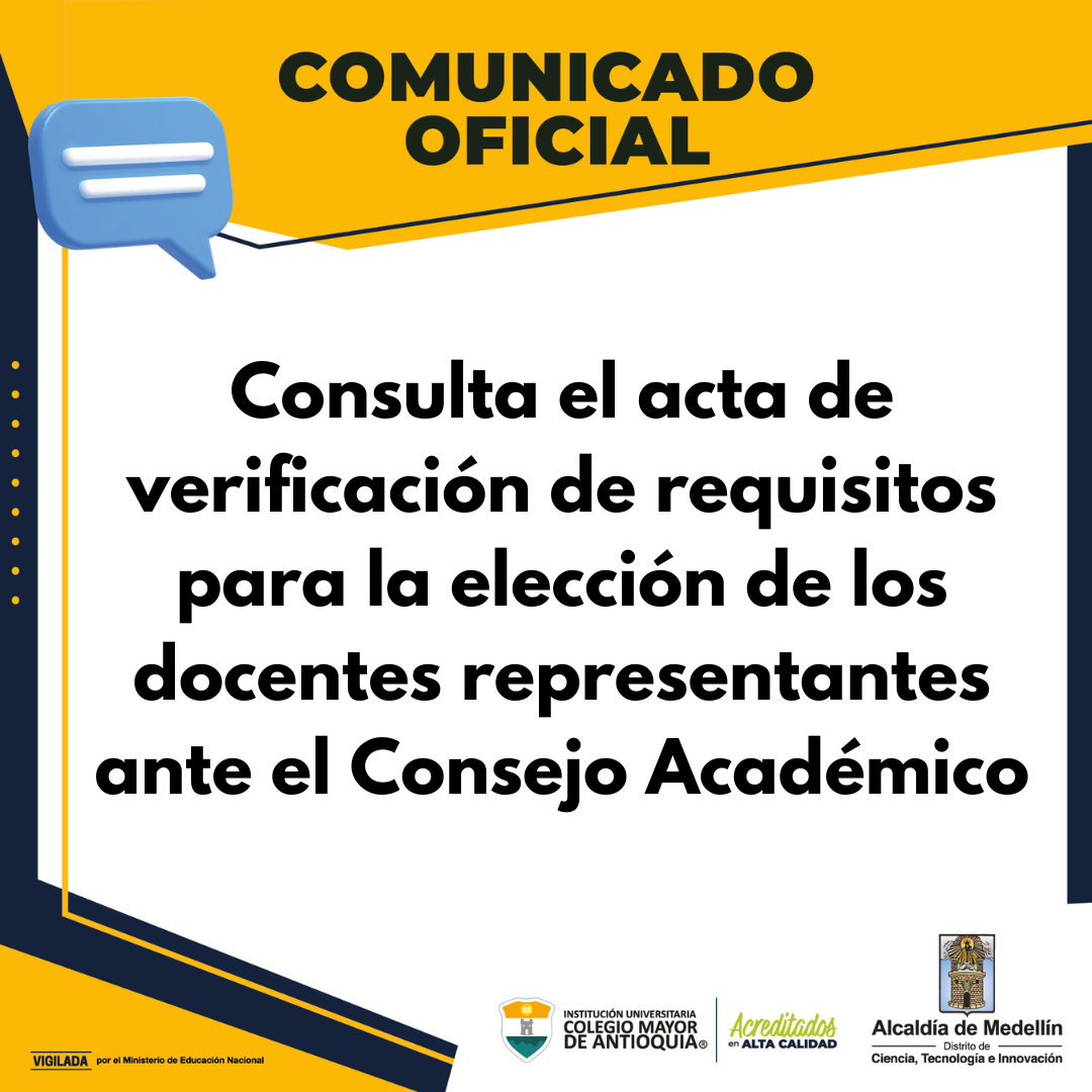 Convocatorias General Noticias Consulta el acta de verificación de requisitos para la elección de los docentes representantes ante el Consejo Académico abril 3, 2025. Conoce el acta.