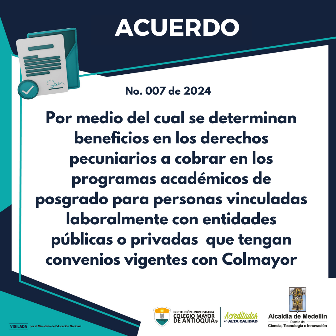Comunicados General Noticias Beneficios en derechos pecuniarios para posgrados de empleados de entidades públicas o privadas que tengan convenios vigentes con Colmayor febrero 7, 2025. Conoce el Acuerdo 009 de 2024.
