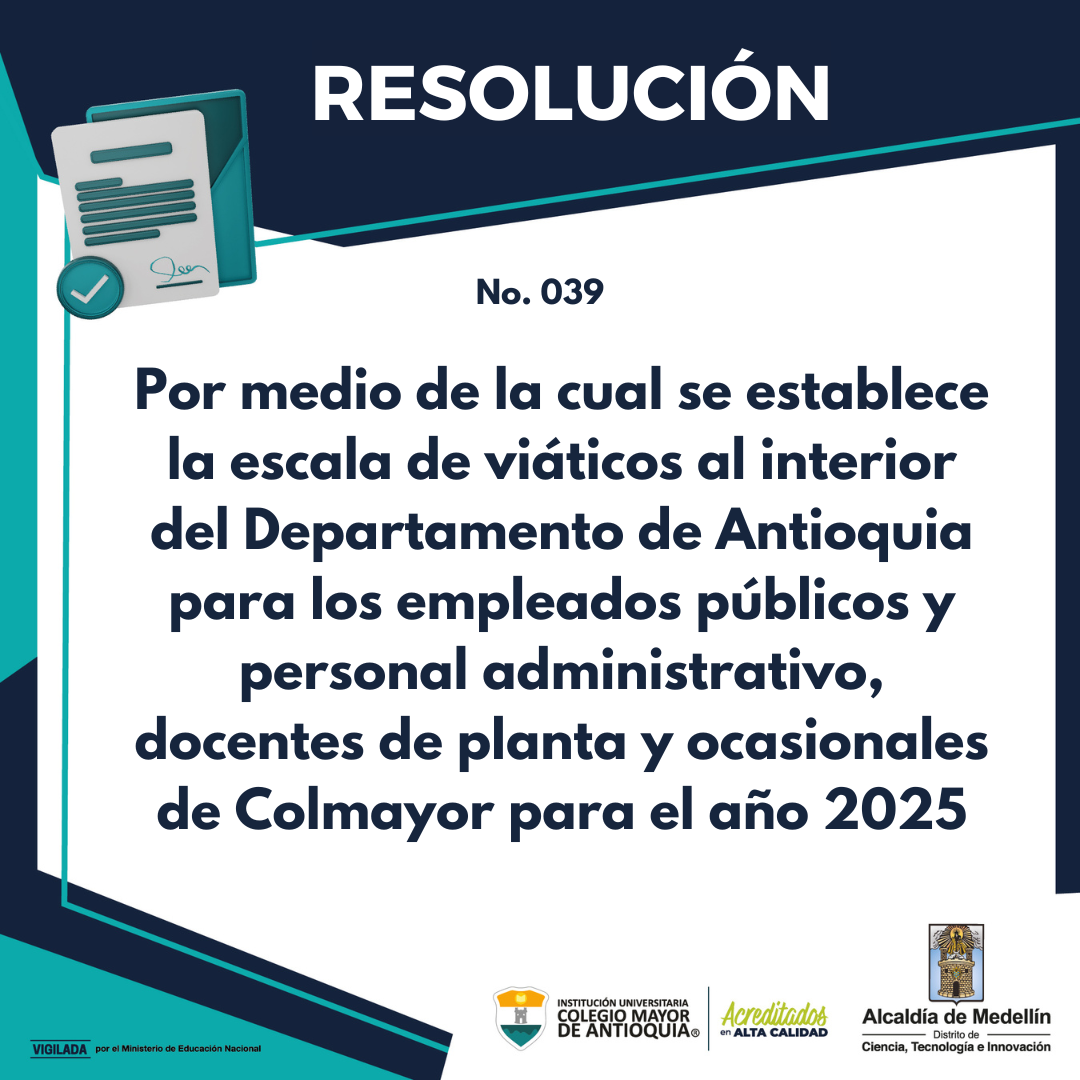 Comunicados General Noticias Escala de viáticos al interior del Departamento de Antioquia para los empleados públicos y personal administrativo de Colmayor febrero 11, 2025. Conoce la resolución 039 de 2025.
