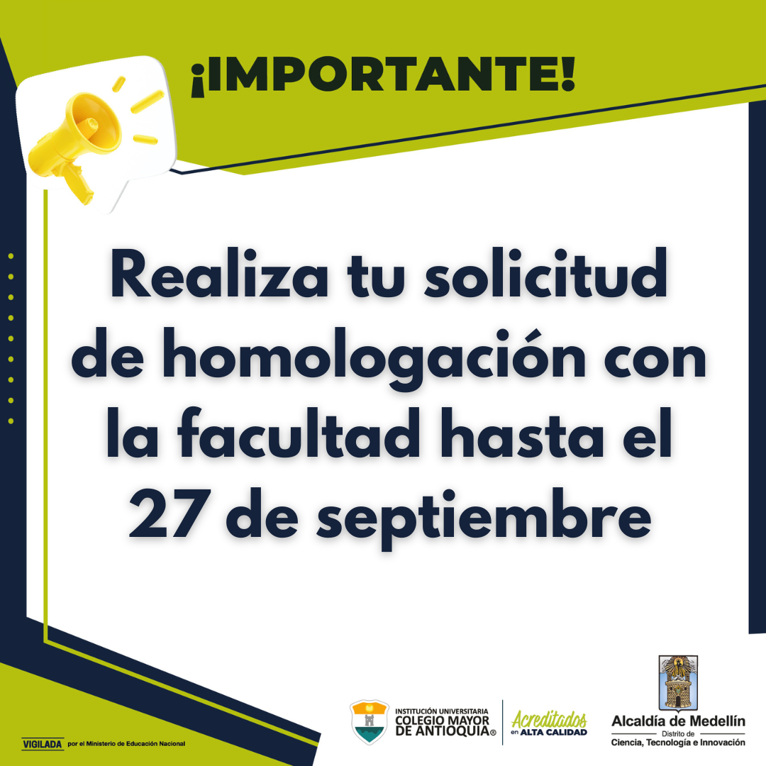 General Noticias Noticias admisiones Solicitud de homologaciones a la facultad septiembre 2, 2024. Realízala hasta el 27 de septiembre de 2024.