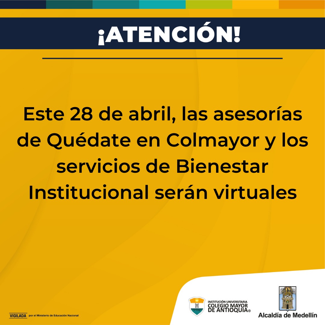 Bienestar General Noticias Quédate Colmayor Atención virtual de servicios de Quédate en Colmayor y Bienestar Institucional abril 27, 2022. Conoce los enlaces de conexión para el día 28 de abril.