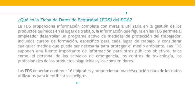 Con este sistema, los fabricantes o importadores deberán elaborar la Ficha de Datos de Seguridad de acuerdo a lo definido en el Sistema Globalmente Armonizado de Clasificación y Etiquetado de Productos Químicos – SGA; así mismo, deben garantizar a la autoridad competente el acceso al soporte técnico y científico utilizado para su elaboración.